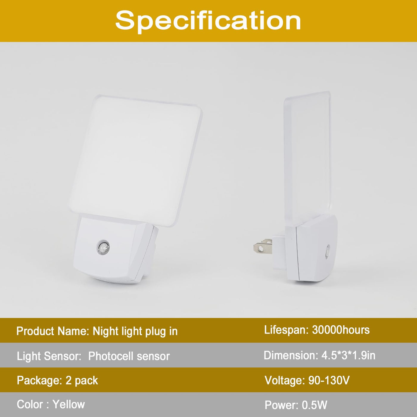 Greenic auto sensor colored LED night light 2 pack, features on the square diffusing panel, smart sensor auto on off, and multiple color choices to meet your needs. Color options: There are red, blue, green, yellow/amber/warm white, cool white/daylight white night lights. Wide usage For red night light/yellow light night light(3000K color temperature), it is perfect for bedroom, kids room, baby nursery. For white night light(6500K), it is great for hallway, porch, garage, which automatically turns off when day breaks. For green night light/blue night light, you can put it in the kitchen, hallway or bathroom, great for lighting up as well as decorative lights. Dusk to dawn sensor These nightlight are light sensitive with built-in photocell sensor, which automatically turns on at night and off at dawn. Modern LookingThey are also modern looking, slim&sleek design. Compact design Compact night light with 2 US flat pin plug. When plugged into the upper outlet on the socket, it wont block the second outlet for hair dryer. Which you can put it in the bathroom. Sleep-friendly It is low light night light, giving off perfect amount of light for night trips yet not too bright. They put out soft calming glow, which is great for kids room, nursery room and adults bedroom as well. Save energy and money: These led night light are eco-friendly, low electricity consumption, no bulb replacement needed, only 2 cents for year. Specification:Sensor type: light sensor/dusk to dawn sensor Input Voltage:AC 110V Power consumption:0.2W Item dimension:3x1.9x4.5 Package dimension: 4.7x1.9x4.7Light color: yellow Power consumption 3000K Package includes:2 pcs nightlight