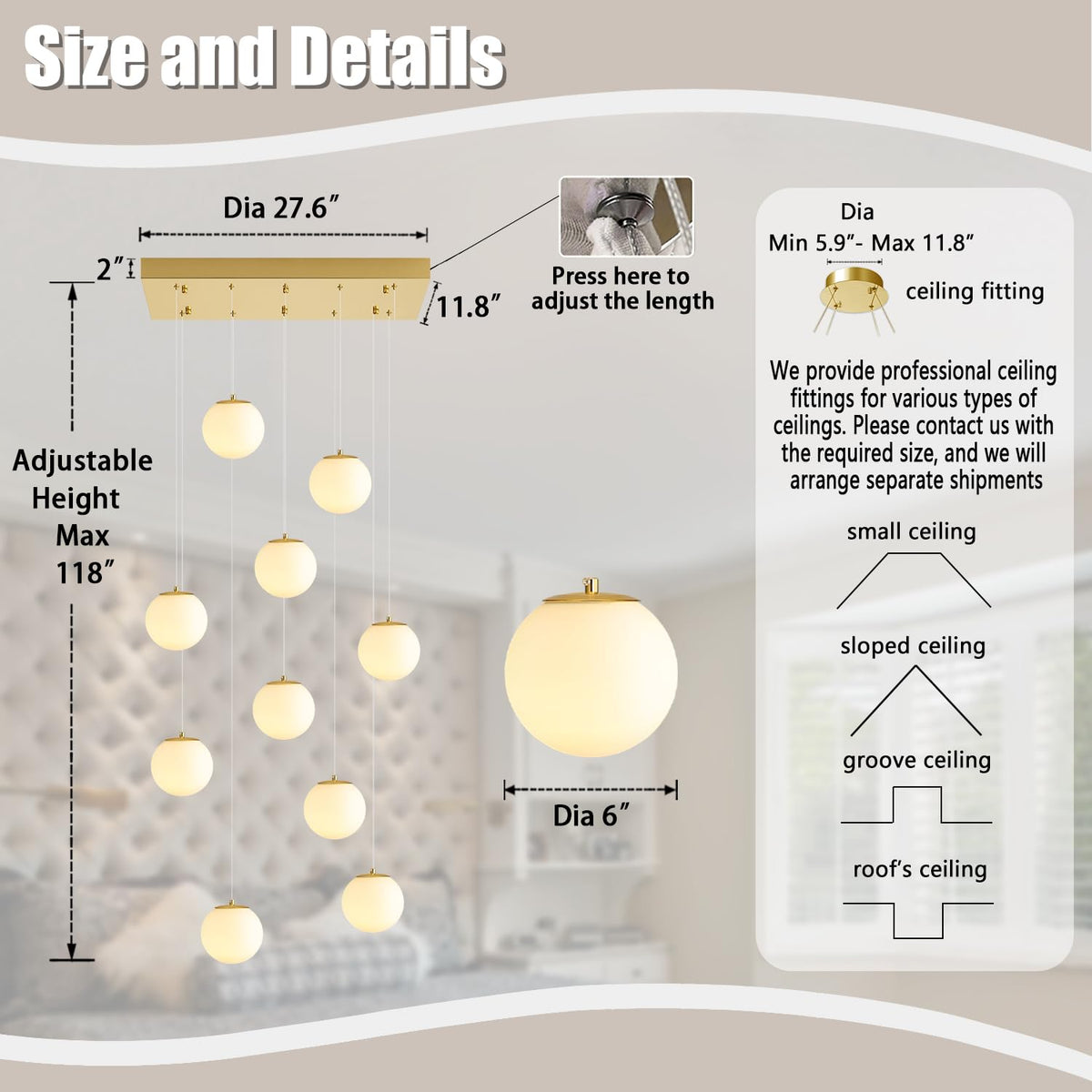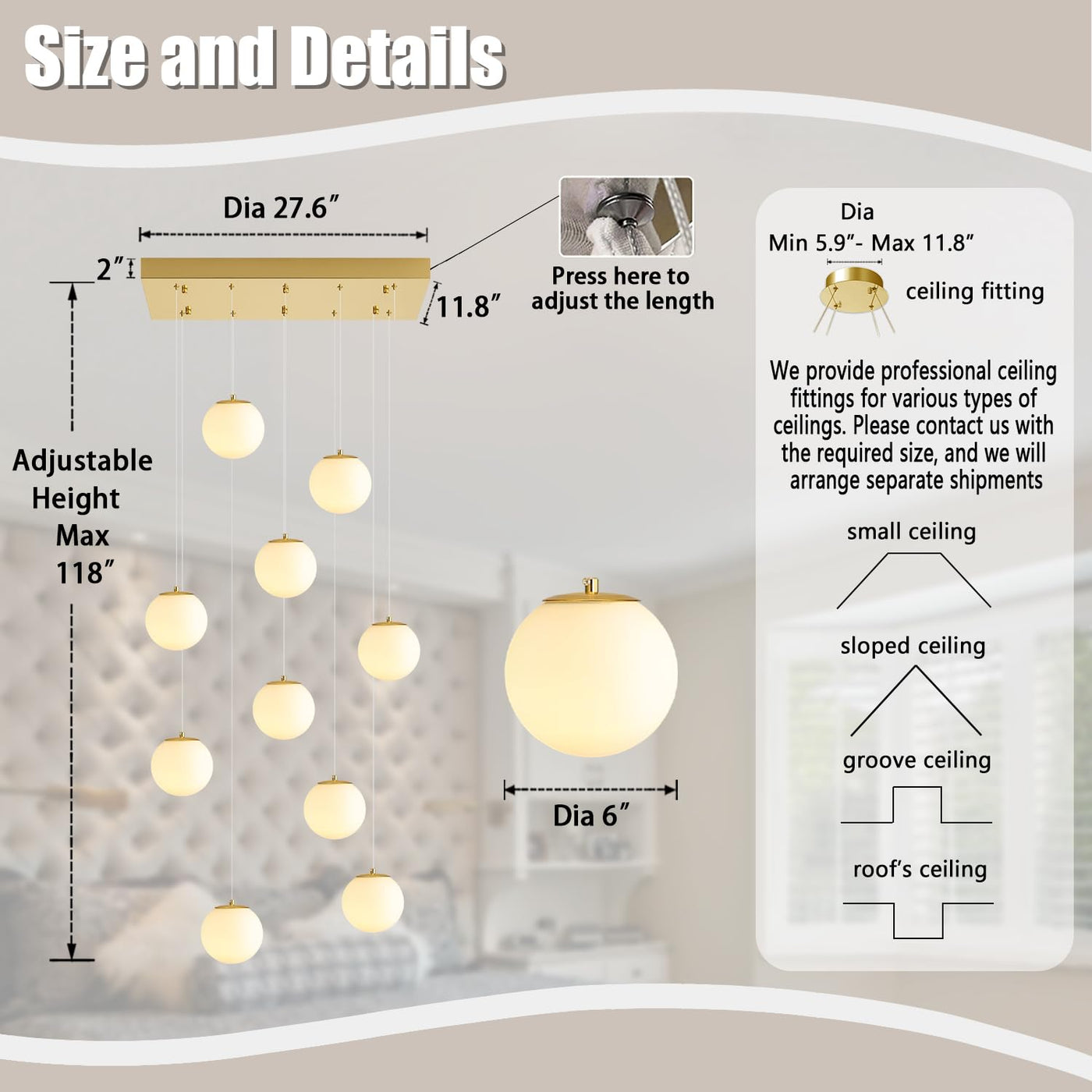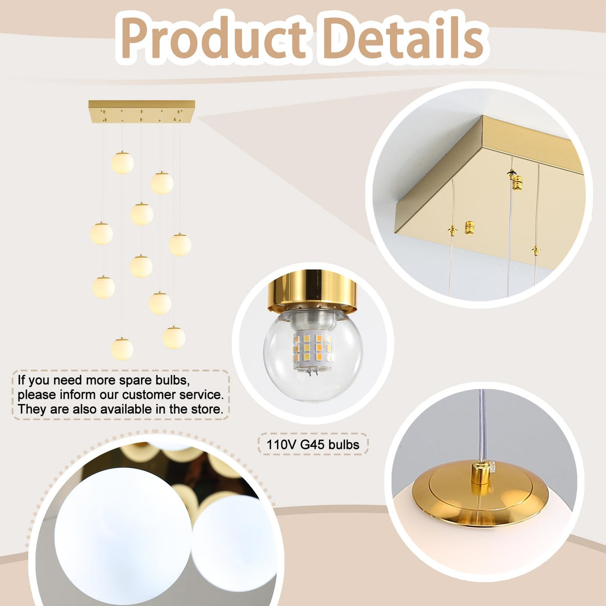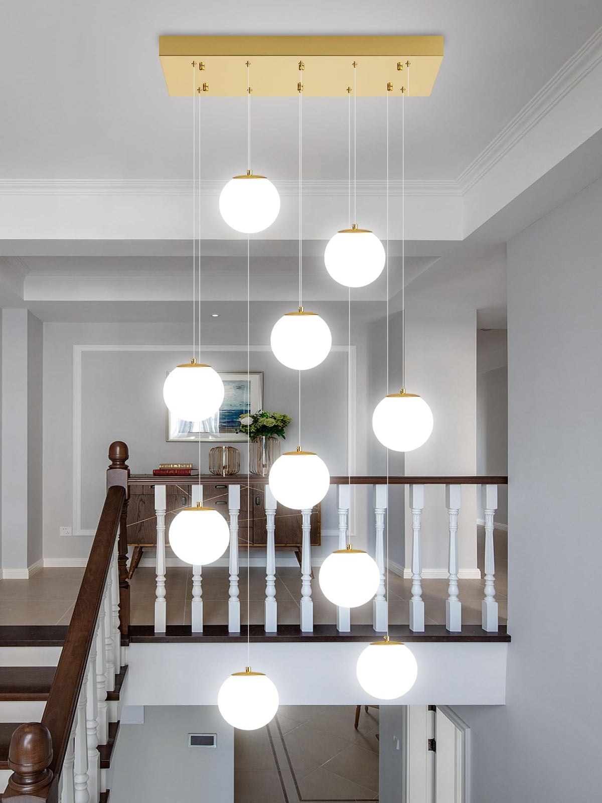 10-Lights Globe Chandelier Gold Pendant Lighting Fixture Hanging Ceiling Light For Dining Room, Kitchen Island,High Ceiling Chan