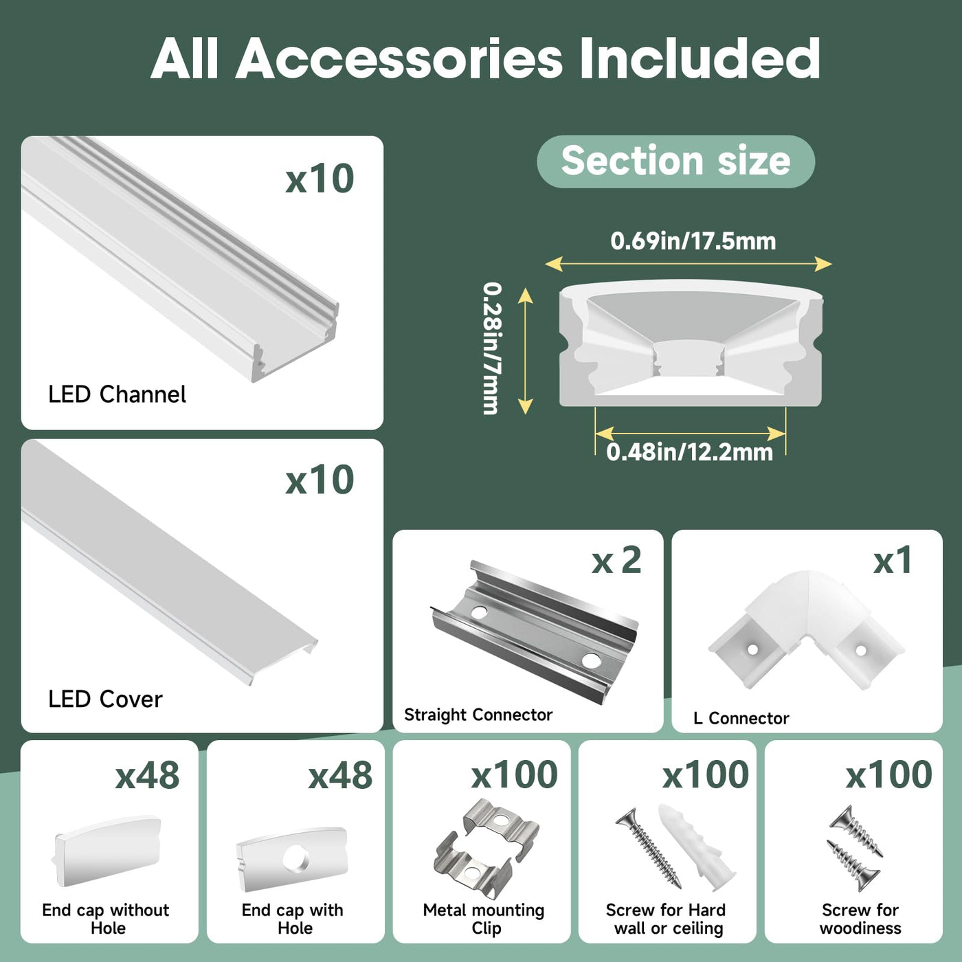 Q: What is included in the 10-Pack U Shape LED Aluminum Channel System?A: The package includes ten 2-meter (6.6ft) long aluminum channel segments with milky covers, 48 end caps (24 with holes and 24 without), 50 mounting clips, 100 screws (50 for wooden surfaces and 50 for ceilings), 2 extension connectors, and 1 L-shape corner piece for easy installation.