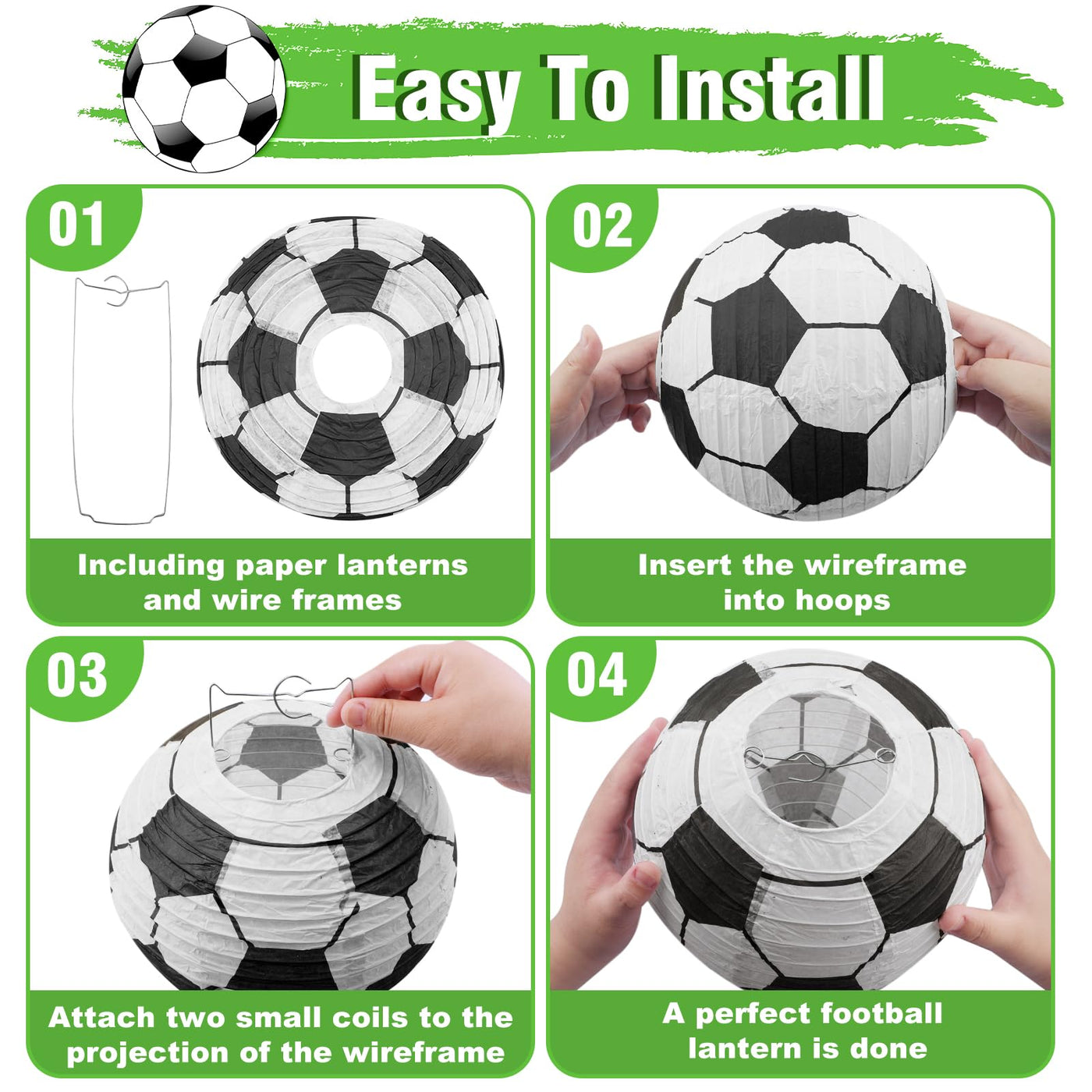 10 Pieces Soccer Ball Paper Lantern Centerpiece, 8 Inch Soccer Paper Lanterns Kit Soccer Hanging Lantern for Birthday Decoration Soccer Parade Team Themed Bar Copa America Game Party Favor Multiple Applications: You can apply these soccer paper lanterns in various occasions, like your soccer theme party, festival party, as the centerpieces for your table, your home decorations, etc., which can enhance the happy and festival atmosphere Vitality Design: Our 8 inch soccer paper Lanterns are characterized by vibrant designs, featuring vivid soccer black white patterns that can inspire positive emotions and create a fun and eye-catching appearance for any celebration. Whether hosting a soccer themed party or loving this sport, these soccer paper lanterns are a fashionable choice that can enhance the atmosphere of any space Easy to Assemble and Hang: These ceiling hanging soccer paper lanterns are easy to install and hang; Each soccer paper lantern comes with a wire frame and a C-shaped fastener, which can be easily hung by opening and inserting into the frame Specifications: Material: paper, metal Color: white and black Size: as shown in pictures Package includes: 10 x Soccer Paper Lanterns