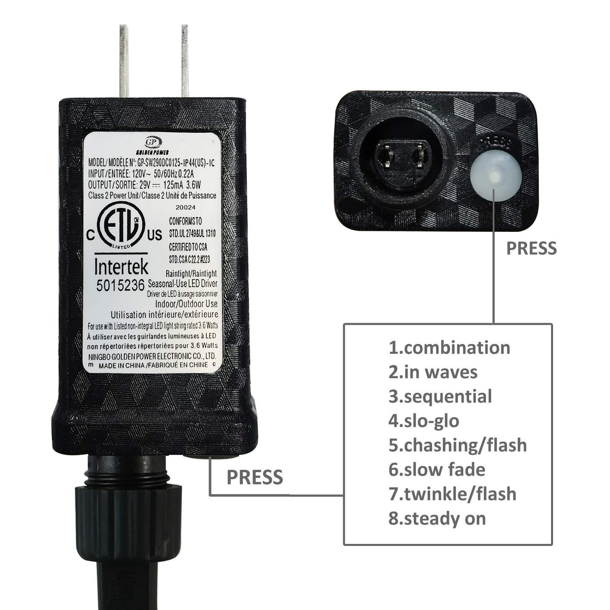 Q: What are the main features of the 100-1000 LED Christmas Lights?A: The 100-1000 LED Christmas Lights feature warm white illumination on a dark green cable, 8 lighting modes to suit various decorative needs, a memory function for ease of use, a low voltage transformer that ensures safety with a 30V output, and an IP44 rainproof rating for outdoor use.