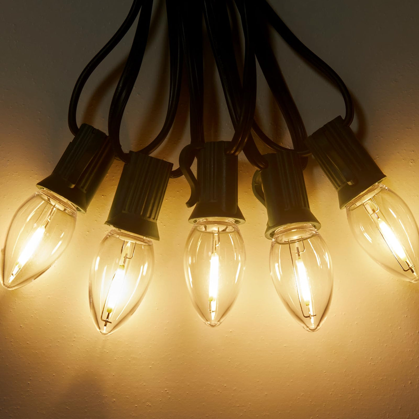 ENERGY SAVING AND MONEY SAVING: Save more than 90% compared to traditional incandescent bulbs. Each clear bulb 1W is equivalent to a 7W C7 incandescent bulb, LED bulbs create enough brightness to add a vintage holiday atmosphere to your house, Christmas tree, yard, party decorations. | HIGH QUALITY: Commercial grade C7 LED replacement bulbs with an average lifespan of 10,000 hours. Good choice for Christmas tree string lights, salt lamps, LED chandelier bulbs, night lights, plug-in night lights, decorative lighting, salt baskets, outdoor patio lights. UL listed, safe for indoor and outdoor use. | EXQUISITE DESIGN: Retro shape and smooth surface create colored glow. String lights suitable for E12 socket, perfect combination of classic style appearance and energy saving efficiency of LED, your house add traditional vintage style atmosphere. | INDOOR AND OUTDOOR DECORATIVE LIGHTING: Plastic bulb housing, shatterproof and waterproof for more durability, no more need to remove glass from broken bulbs, bright LED C7 replacement night light bulbs create a cheerful festive atmosphere during the holidays, Christmas, or all year round. | Bring the magic of Christmas back to your outdoor lighting projects when you hang C7 bulbs along your roof and wrap them around columns and trees!