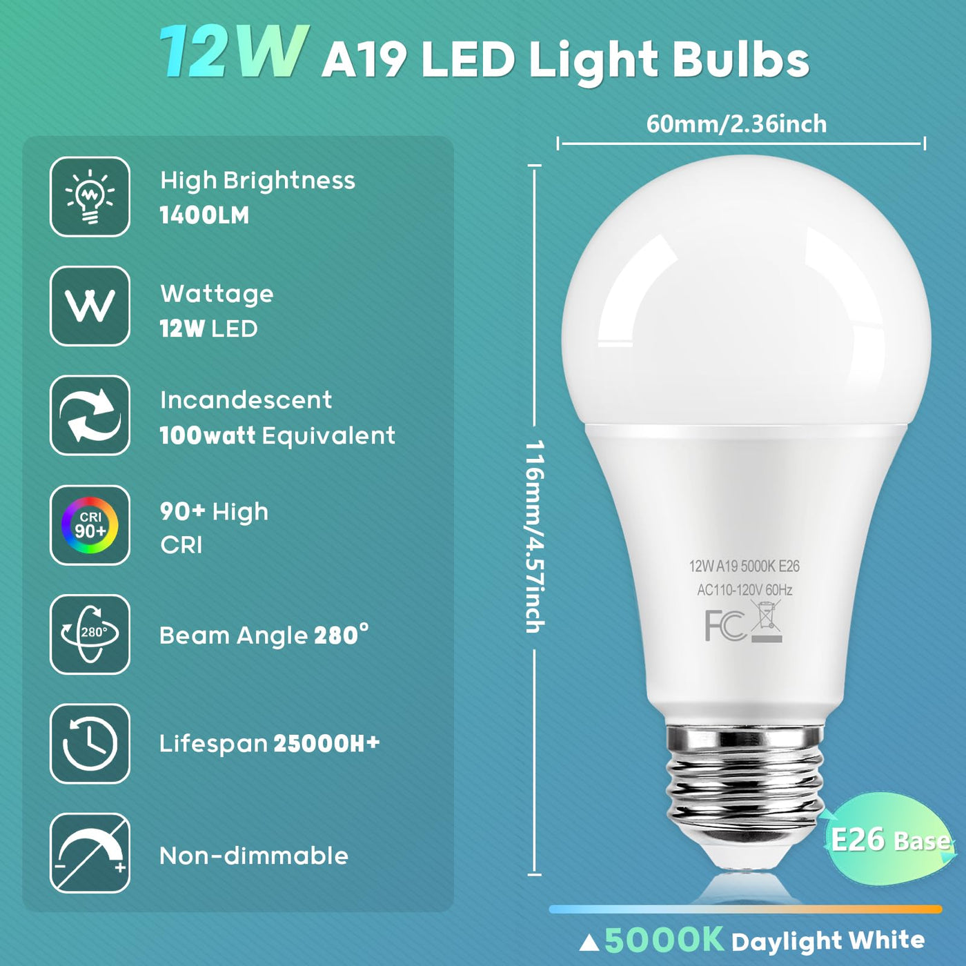 100 Watt Equivalent Led Light Bulbs, A19 12W Super Bright Daylight White 5000K Led Bulbs, 1400 Lumens Standard E26 Medium Screw