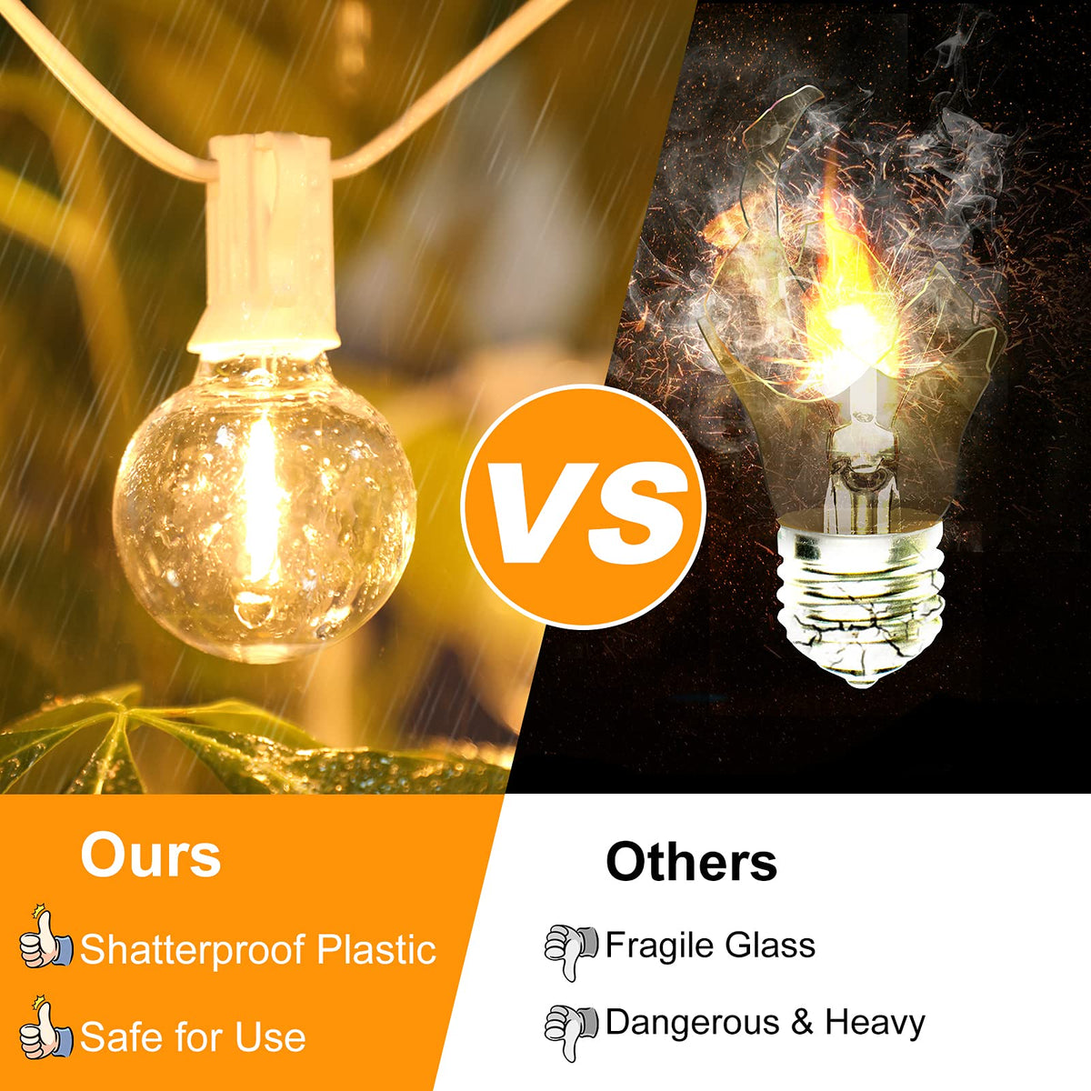 Q: What material are the bulbs made from?A: The bulbs of the G40 string lights are made from shatterproof plastic, ensuring safety and durability compared to traditional glass bulbs, which can break easily.