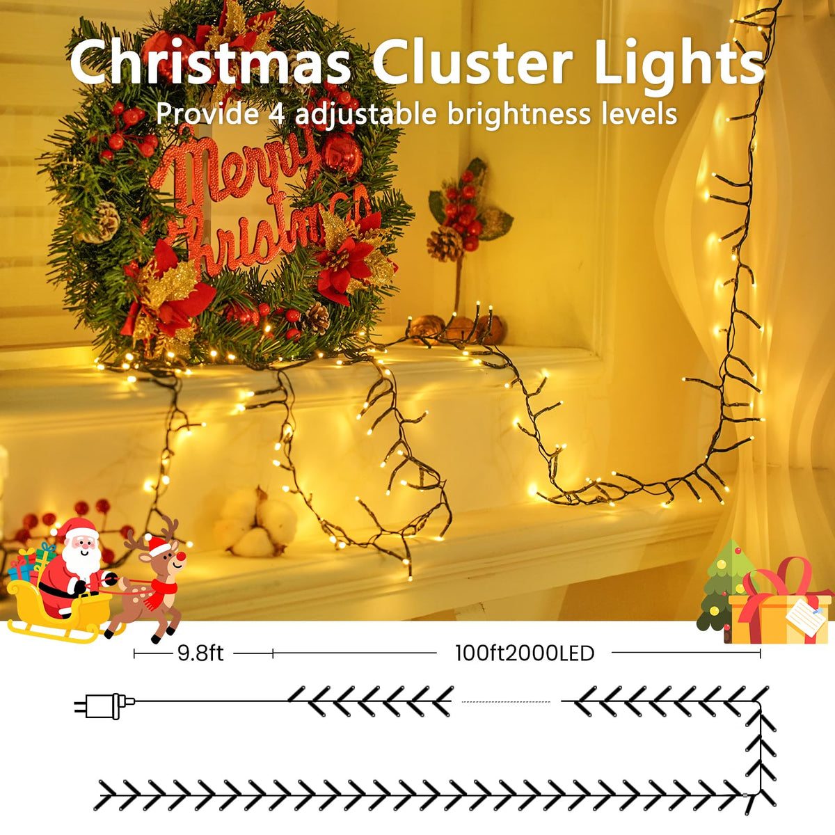 100Ft 2000 Led Cluster Christmas Lights Christmas Tree Lights Outdoor Indoor With 8 Modes & Timer & Remote Fire ers String Lights Waterproof For Garland Party Xmas Decorations Warm White