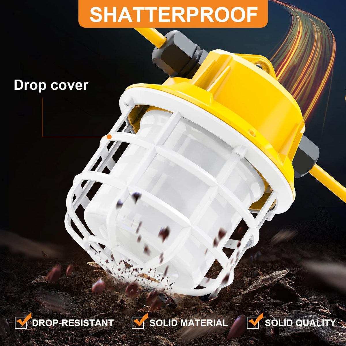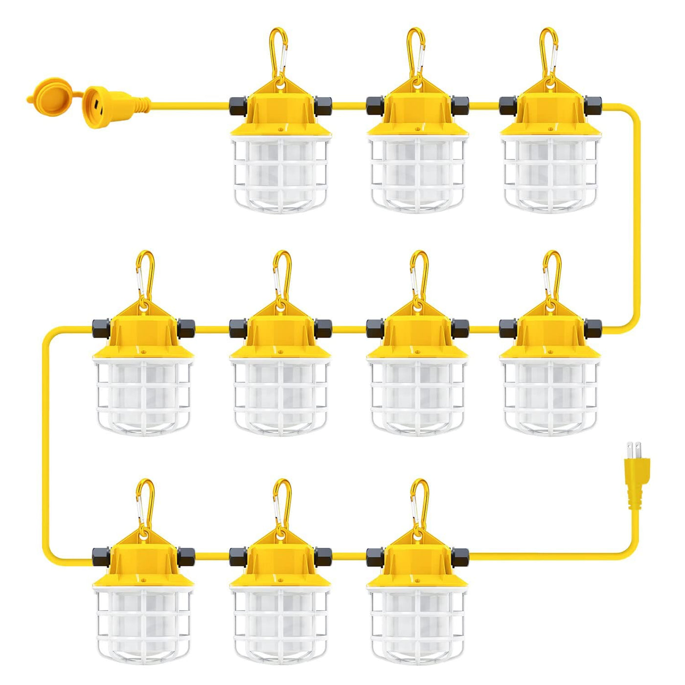 Q: Where can I use these construction string lights?A: These versatile lights are perfect for construction sites, factories, workshops, mines, and various outdoor and indoor locations such as parking lots, docks, attics, basements, warehouses, and more.