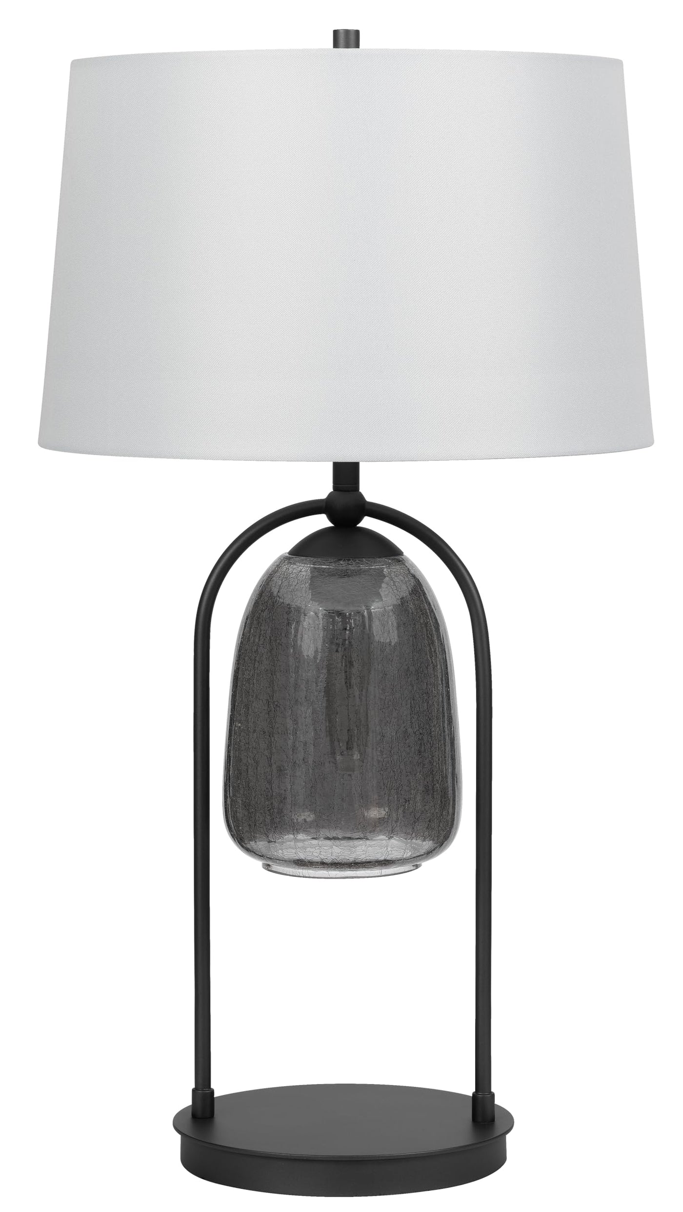 Q: What materials are used in the construction of the lamp?A: The lamp is made from durable metal and features a stylish smoked crackle glass design, combining elegance with functionality.