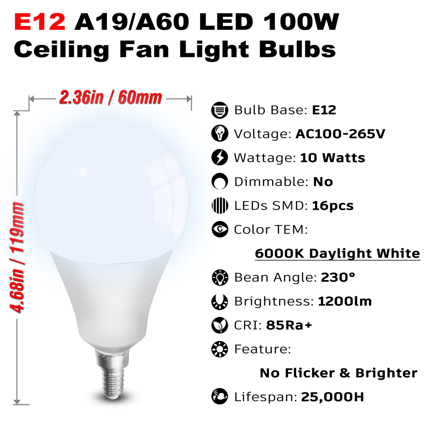 Alide E12 A19/A60 Led Candelabra Light Bulbs Globe Shape 10W 6000K Daylight White For Ceiling Fan Chandelier Lighting Wall Lamp(Non-Dimmable) E12 A19/A60 Globe Shape Bulbs 10W Led 1200Lm, E12 100W 120W Halogen Bulbs Equivalent, Saving More Than 90% Of Energy And Money No Flicker,&Nbsp;No Buzz, Not Hot&Nbsp;When Work, Offer Quiet Comfortable Safe Healthy Lighting For Your Rooms Bright White &Amp; High Cri,&Nbsp;6000K Daylight Cool White(Offer Hight Bright Lumens), Cri≫85 Ra Easy To Install, Can Be Easily Fitted E12 Socket, This E12 Bulb'S Size (2.36*4.68Inch) Long Lifespan,High Quality Driver, Led Chips, Good Heat Dissipation Ensure Bulbs'Long Lifespan Over 25,000 Hours Applications Of E12 100W Equivalent Round Led Bulbs: Standard E12 Candelabra Screw Base, Ideal For Ceiling Fan Light, Chandelier, Pendant, Turkish Lamp, Bathroom Vanity Light Window Lighting, Wall Sconce, Desk Lamps, Furniture Lighting, Office Lighting, Merchandise Lighting, Porch Lights,Decorative Lighting, Accent Lighting, Art Galleries Display Lighting, Interior Light, Bedside Floor Lamp, Recessed, Downlight Lighting, Track Lighting, Range Hood, Etc Parameters Of E12 Candelabra Base Ceiling Fan Bulbs: Socket/ Base: E12 Size:&Nbsp;0.23*4.68Inches Wattage(Power): 10W Working Voltage: Ac110-130V Color: 6000K Daylight White Luminous Flux: 1200Lm Viewing Beam Angle: 230 Working Temperature: -20?~+40? Lifespan: 25,000 Hours Material: Aluminum+Pc 1 Package Contain: 3Pcs E12 Led Bulbs 10W Daylight White Non-Dimmable A19/A60 Globe Shape Attention: Please Pay Attention To The Base Is&Nbsp;E12&Nbsp;Candelabra Base, Not E11 E17 E26 E27!! Please Notice This Is&Nbsp;Non-Dimmabe&Nbsp;E12 Led Bulbs 10W To Replace 100 Watt 120 Watt E12 Halogen. Must Cut Off The Power When You Install The E12 Bulbs,These Bulbs Are High Voltage!! Don'T Use In The Humid Environment Or High Temperature(≫40C ),Like Oven,Etc. Can'T Use In Totally Enclosed Luminaries, Please Pay More Attention On This. Be Caraul The Size: Our E12 10W Globe Shape Ceiling Fan Light Bulb'S Size: 2.36*4.68Inch, Please Check Your Fixture Before Purchase. How To Choose Right Color Of E12 Small Base Led Candelabra Bulb? 2700-3000K Warm White: Soft And Comfortable 4000K Natural White: Not Too Warm Or Too Cold, Between Warm White &Amp; Cool White 6000K Cool White: Very Bright And White, Use For Place Where Need High Brightness