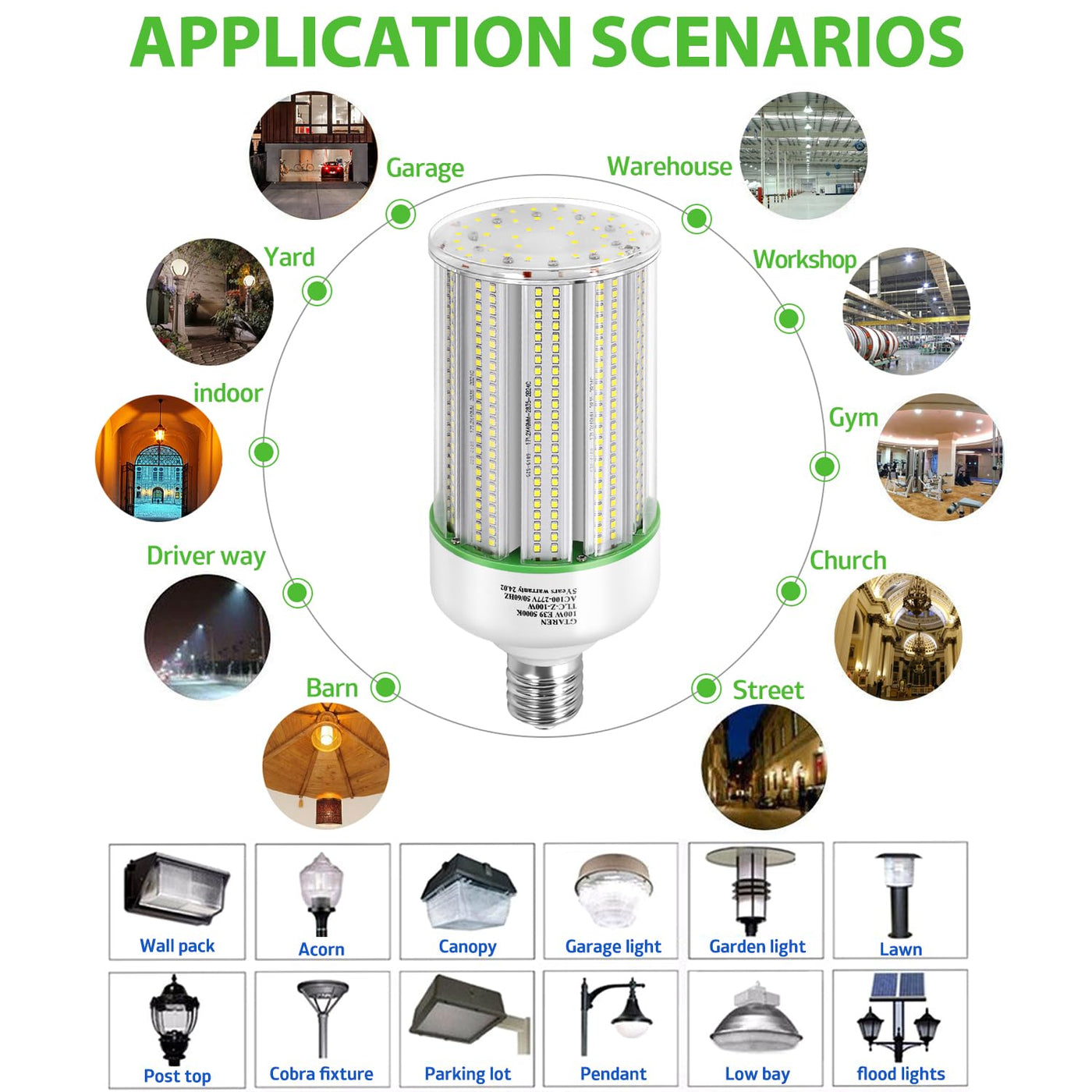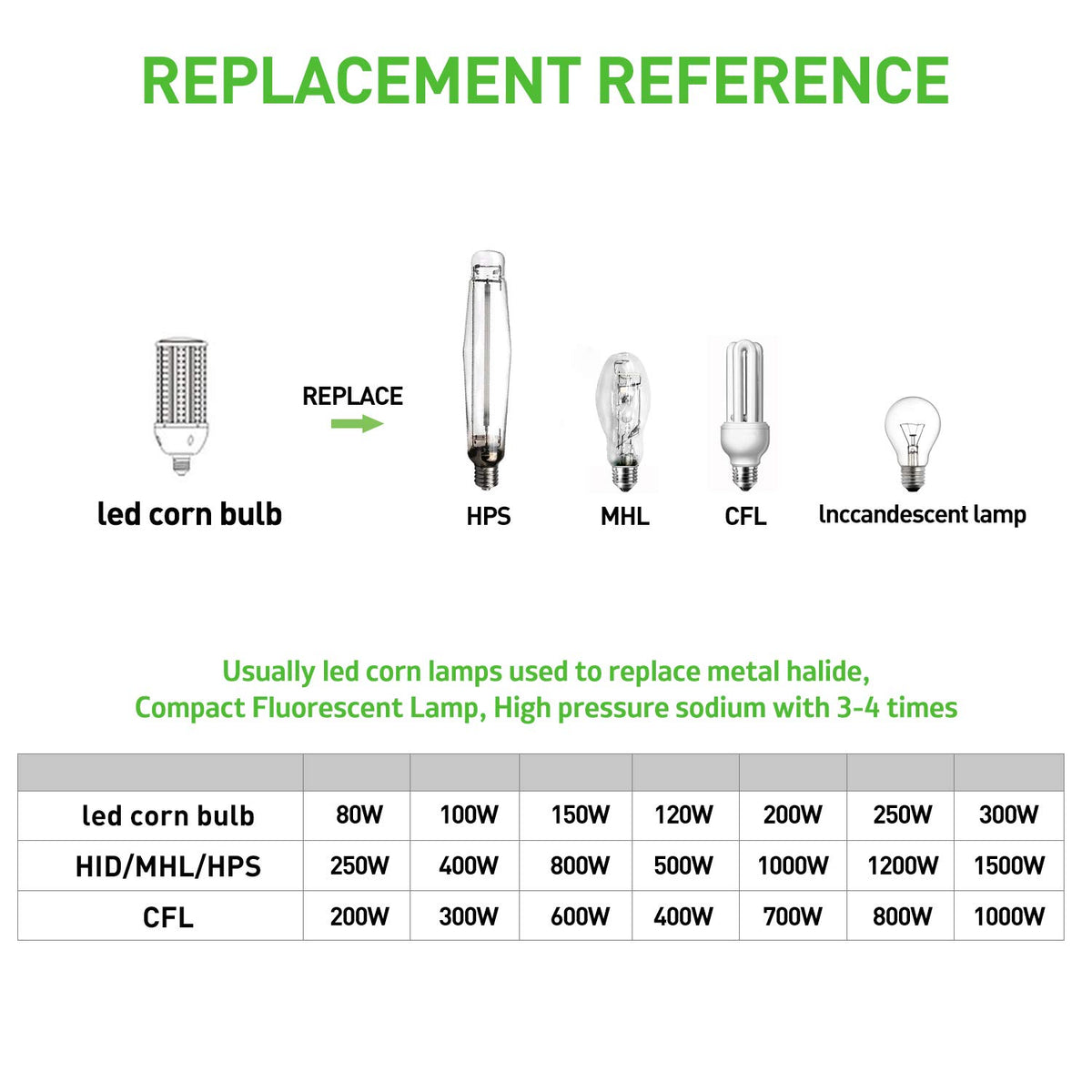 GTAREN Specializing in high-quality LED replacement products in the past decade,We have more than 40 products.In addition,With improved production equipment,we can independently produce LED radiator,LED power supply and LED lamp plastic parts The LED corn lamp certified by ce can be used to replace 70W,100W,150W,175W,200W,250W,320W,400W and 600W 800w 1000w metal halide lamp (MHL),High intensity discharge bulb (HID),High pressure sodium bulb (HPS),Incandescent bulb and CFL bulb vapor bulbs perfectly. Besides,LED corn Bulb is widely used in outdoor indoor lighting projects,Warehouse lighting,Street lighting,High bay & low-bay LED lighting,LED flood lighting,Industrial spaces lighting,Garage lighting,Commercial lighting,Shopping lighting and parking lot lighting projects,Factory lighting,Wall pack lighting projects,Area lighting,Driveway lighting,Post top lighting,Barn lighting,Patio lighting,Courtyard lighting,Garden lighting projects,Canopy light projects and so on. It not only has strong lightness, but also is high-efficiency. In addition,We provide five-year warranty. With it, let us do energy conservation together Specification: CRI: >80 PF: >0.9 THD: <20% Wattage: 100W Lumen Efficacy:140lm/w. Voltage:AC110V-277V LED Lamp:SMD2835LED Brightness:14000lm Color Temperature: 5000 Kelvin Socket:E39/E40 Waterproof: IP64 Emitting Angle:360 degrees NOTICE: ? Make sure to remove or bypass the ballast in the fixtures before installing.Don't need ballast, just wire them directly. ? Suitable for use in enclosed luminaires,Please CONFIRM the installation size ? The input voltage and lamps should be matched(AC110V-277V) ? IP64 waterproof rate,Suitable for damp locations(Do not use with dimmers) In the Box: