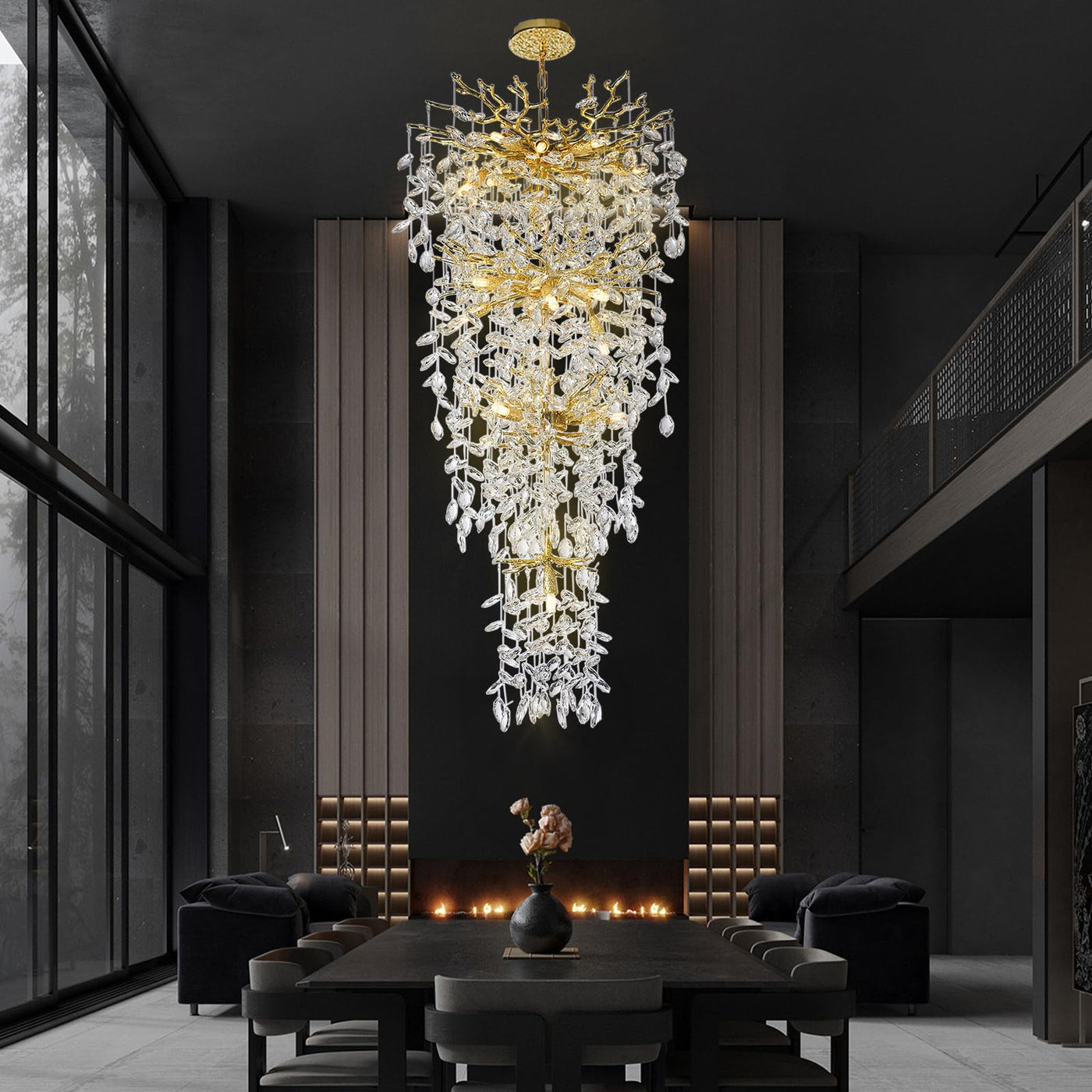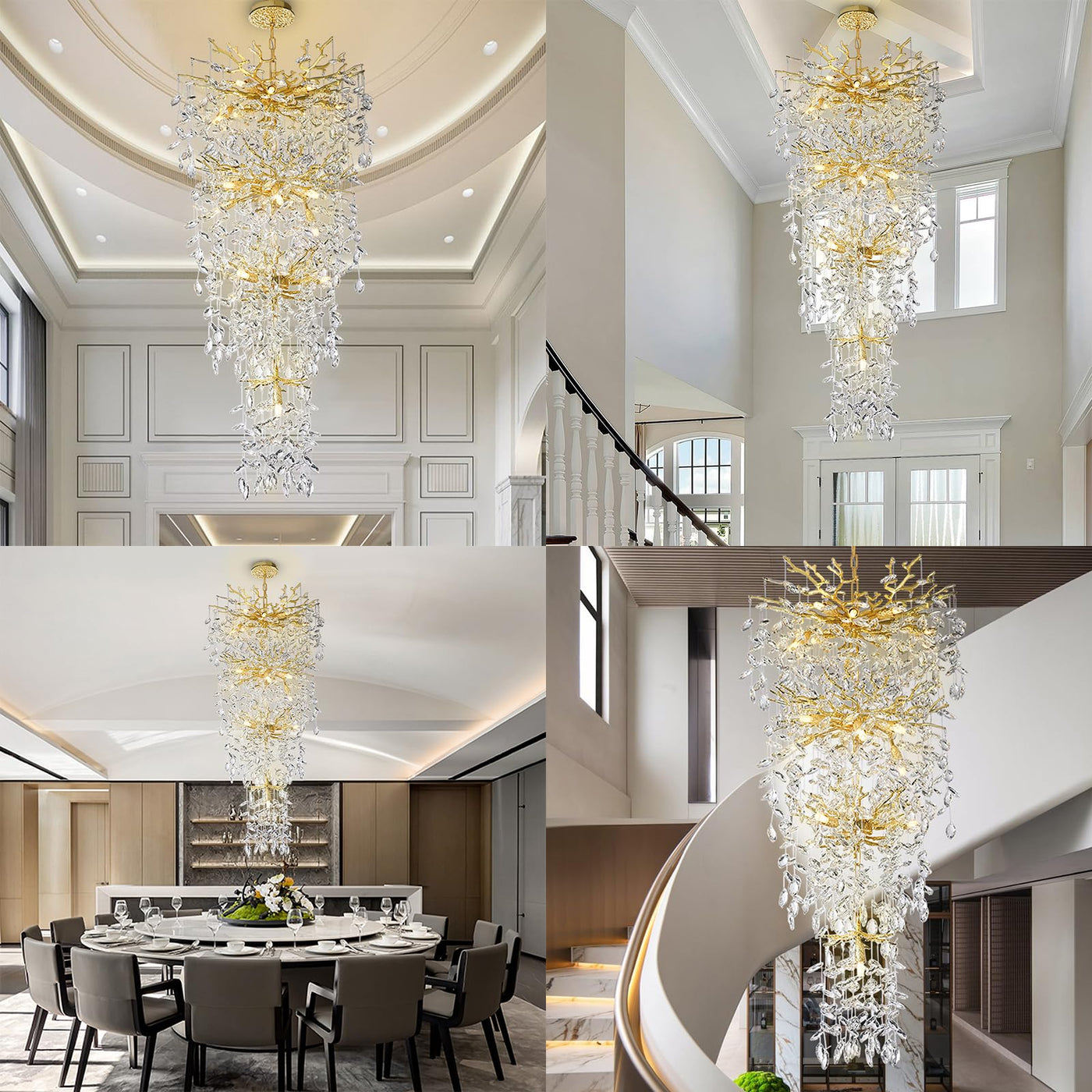 YUYI Chandelier for High CeilingsThe high ceiling chandelier is crafted with exquisite golden decorative branches and stunning K9 transparent crystals that are pure, romantic, and shimmer like diamondsFeature: Its metal construction is hang-forged by our artisan blacksmiths and covered with a luxurious frosted finish. Branches drip with hand blow glass teardrops that reflect light across your roomHard-wired:Can be Installed on sloped or flat ceilings. Capable of being dimmed with compatible dimmable bulbs (not included).Adjustable Length:The chandelier creates a romantic atmosphere. It can help to decorate your home and add a comfortable ambiance. It is perfect for your foyer, staircase, entryway, dinning room, living room