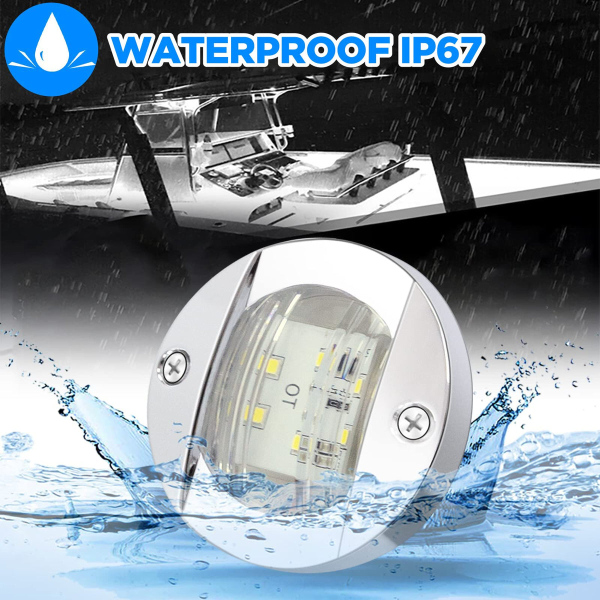 Specifications: -LED Type: 6-2835-SMD,6Pcs 2835 high quality SMD LED each light -Voltage: 12V DC -Waterproof: IP67 -Diameter: 3 inch -Light color: White -Material:Stainless steel polished housing is anti-corrosion, good waterproof performance and durable in using.Clear plastic lens are constructed of premium quality,impact resistant plastics,IP67 Waterproof,can work under any conditions.No need to worry about marine working. - Install:2 Wires connection (Black wire is Negative, Red wire is Positive),Flush mount.