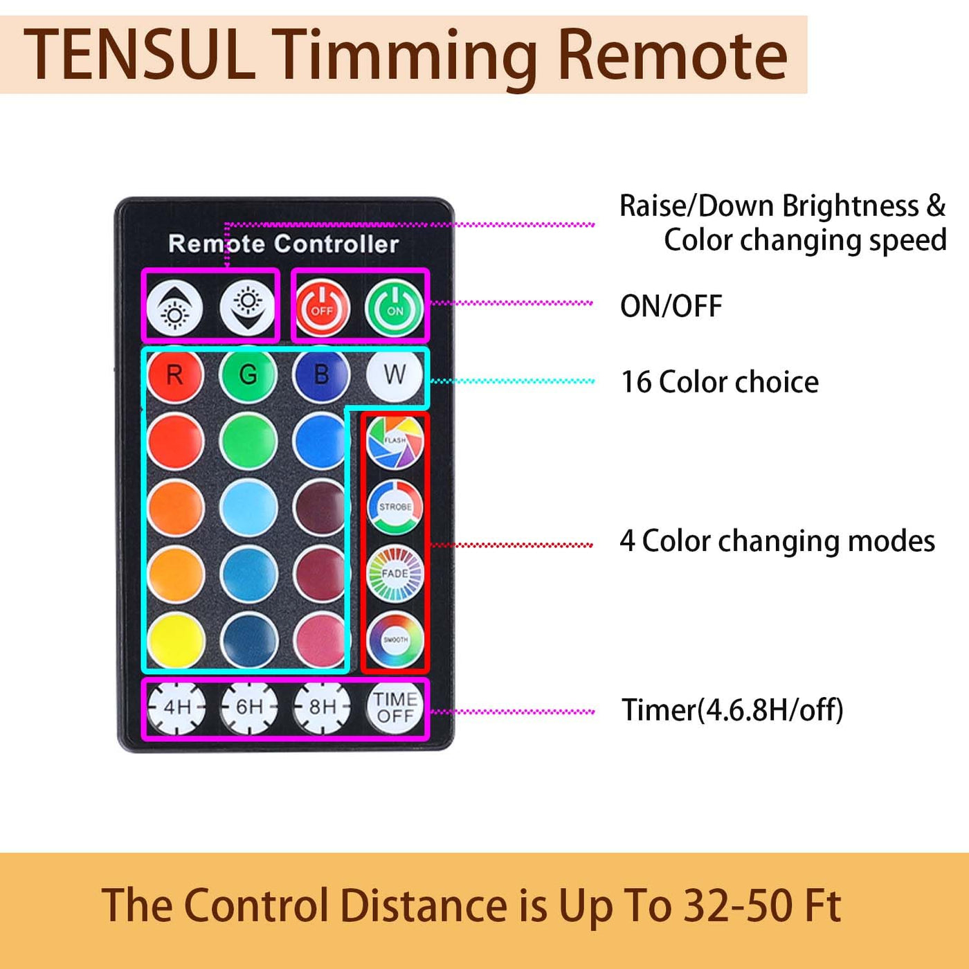 Q: What are the main features of the 10W Pond Lights?A: The 10W Pond Lights feature 16 colors and 4 flashing modes controlled by a remote, a timer function for 4/6/8 hours, and are made with an IP68 waterproof design, making them suitable for outdoor use in ponds and fountains.