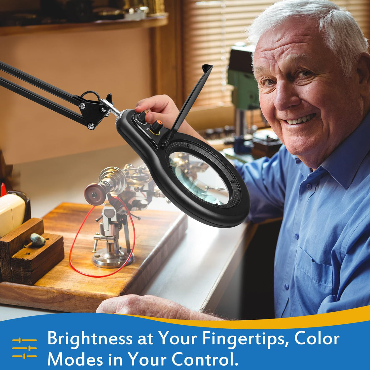Q: How does the lighting work on this magnifying glass?A: The magnifying glass comes with a stepless dimmable light that allows you to adjust both brightness and color temperature using a dual knob control. This feature helps reduce eye strain and fatigue, catering to different lighting preferences.