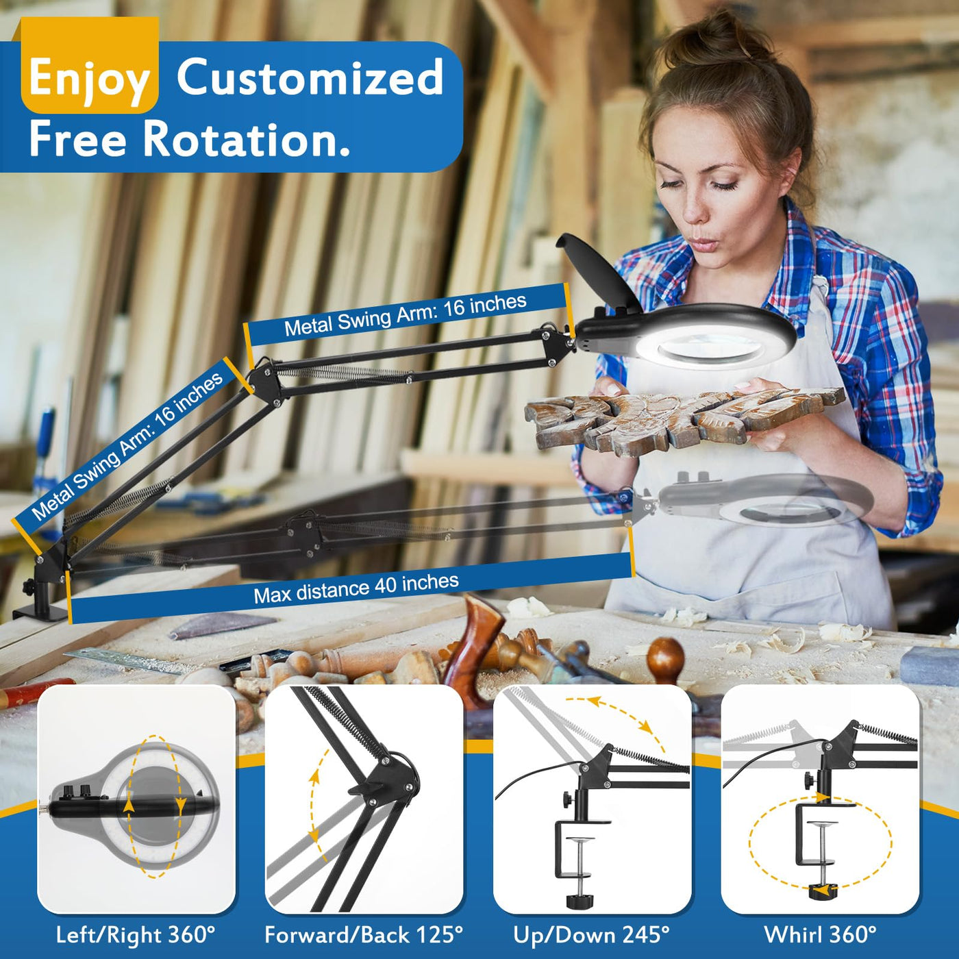 This Magnifying Lamp Features A 10X Magnification With An Hd Glass Lens, Dual Knobs For Precise Brightness And Color Temperature Control, And A Sturdy Metal Clamp For Stability. The Protective Cover Prevents Dust And Scratches. The Ultra-Long Adjustable Arms Provide Flexibility For The Best Viewing Angle, Ideal For Detailed Crafts And Vision Aid Needs. Specification: Color: Black Glass Lens: 4.3 Inch Magnification: 10X Light Source: Led Magnifier Lamp Color Temperature: Knobs Stepless Dimming Material: Alloy And Glass Each Arm Length: 2*16 Inch Clip Maximum Opening Size: 2.6 Inch What You Get: 1 * Led Magnifying Lamp 1 * Metal Clamp 1 * Adapter 1 * Cleaning Cloth 1 * User Manual