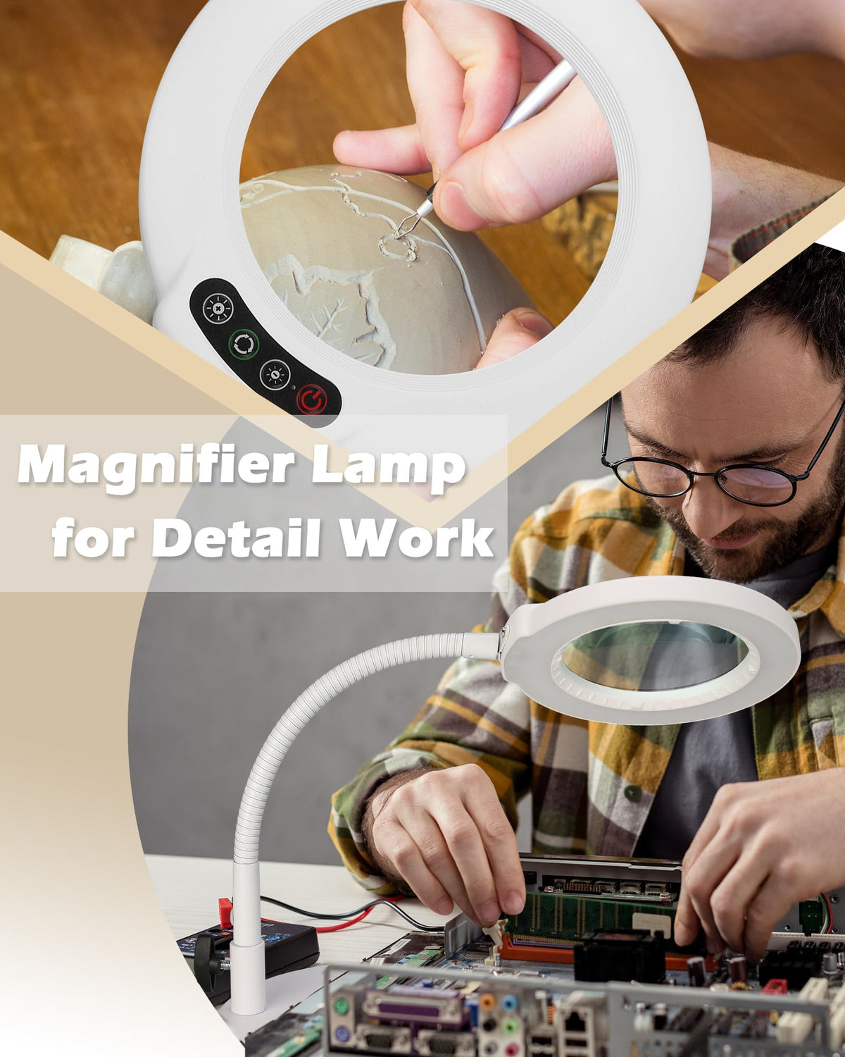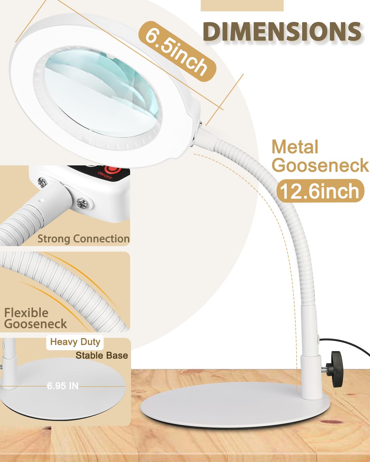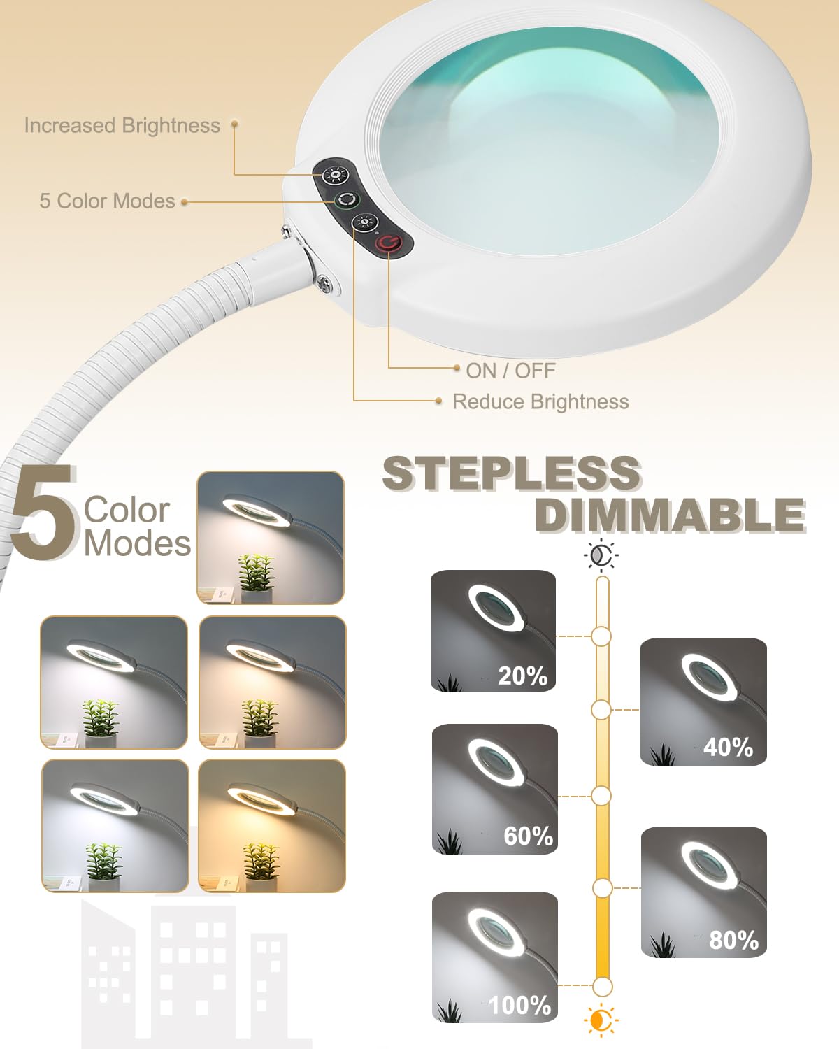 Family Gift: Perfect for Birthday gifts, Mother Day's Gifts, Thanksgiving gifts, Christmas gifts, New Year, and all Holiday gifts. Also good idea for grandmothers, grandfathers, moms, dads, wives, husbands, old friends and more. Convenient Light Head Switch: The control switch button for our magnifiers is on the head of the lamp, and the control switch is within easy reach, making it easy to adjust the light without having to stop what you're doing. High-Quality Magnifier: Real glass lens provides 10X magnification to see small details easily. 5 Color Modes & Stepless Dimmable: Providing ideal light levels for painting, sewing, jewelry making, jigsaw puzzles, cross-stitch, and knitting by different lighting modes and brightness options. Eye Protection: Soft LED for natural color and shadow-free magnification. The magnifying lamp won't make eyes fatigued staying in the light for a long time.