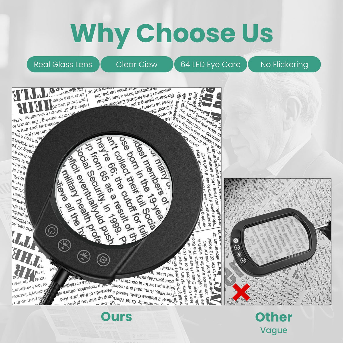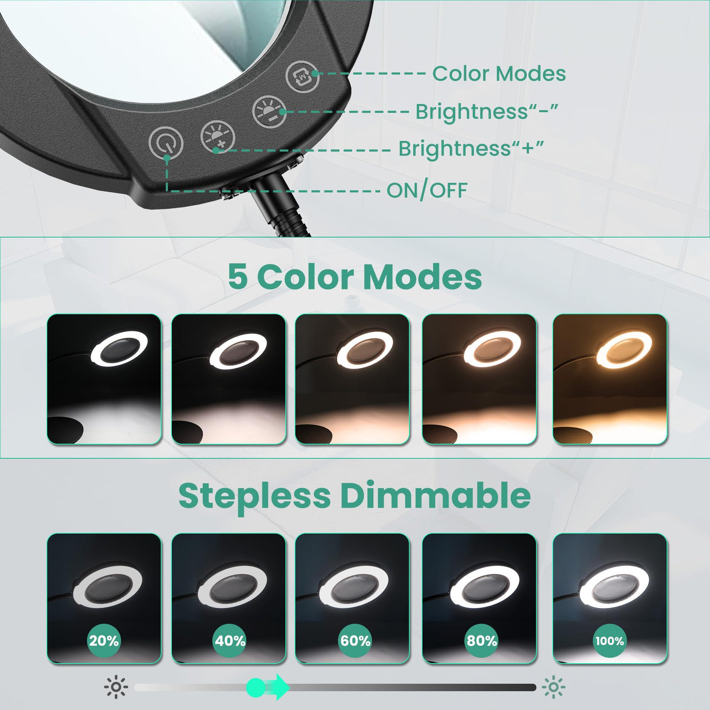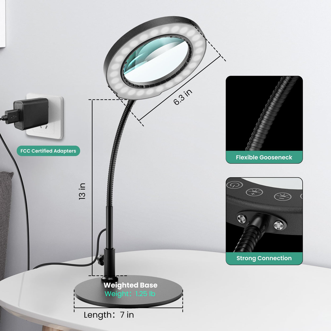 Powerful Magnification: The product features a 10X magnifying lens and a 4.3-inch high-definition glass lens, providing exceptional clarity for close-up tasks. Whether you're examining fine details or working on delicate crafts, this magnification ensures precision and comfort Versatile Lighting Options: With 5 color modes and 5 levels of stepless dimmable lighting, this magnifier offers customized illumination for any task. The 64 LED lights deliver bright, shadow-free illumination up to 800 lumens, ensuring optimal visibility in any environment Innovative Design: Its 12.7-inch gooseneck hose design offers flexible adjustment, allowing you to position the lens exactly where needed. The 7-inch diameter weighted and anti-slip metal base ensures stability, preventing accidental slips or movements Ideal for a Range of Applications: This magnifier is perfect for a variety of close-up work, including crafting, painting, sewing, and nail art. It's also a great gift for elderly or dad loved ones, especially those who enjoy hobbies that require fine detail work. The user-friendly design makes it easy to operate, even for those with limited dexterity Superior Quality and Craftsmanship: Made from high-quality materials, this magnifier is built to last. The durable construction and fine craftsmanship ensure years of reliable use, making it a worthwhile investment for any hobbyist or professional