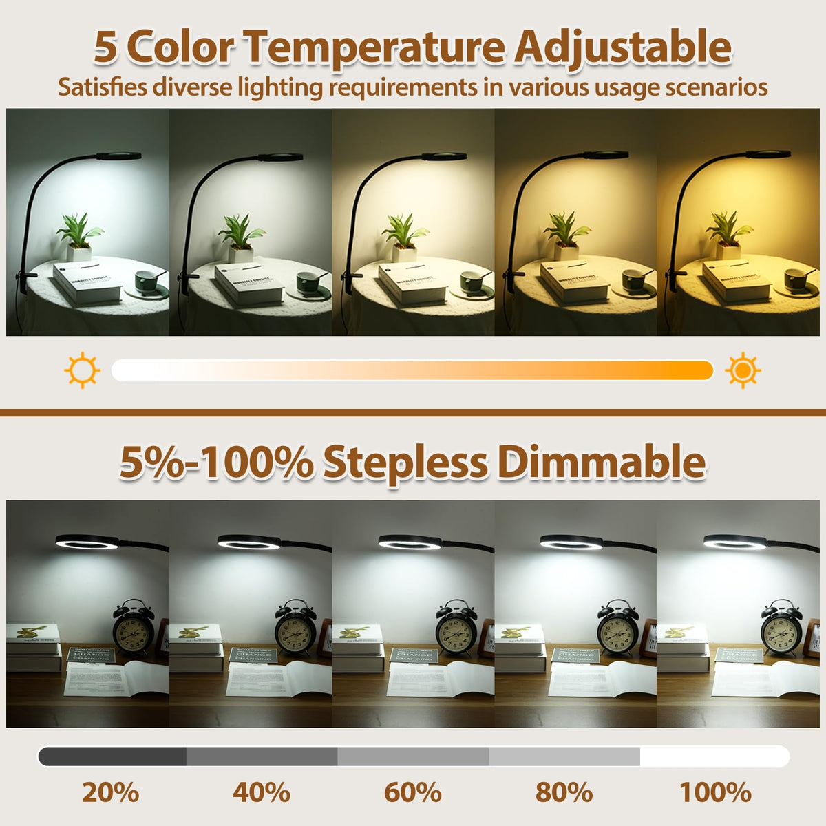 Q: Can I adjust the brightness and color temperature of the lamp?A: Yes, the lamp offers 5 different lighting modes and stepless dimming from 5% to 100% brightness, allowing you to customize the light according to your needs for various tasks.