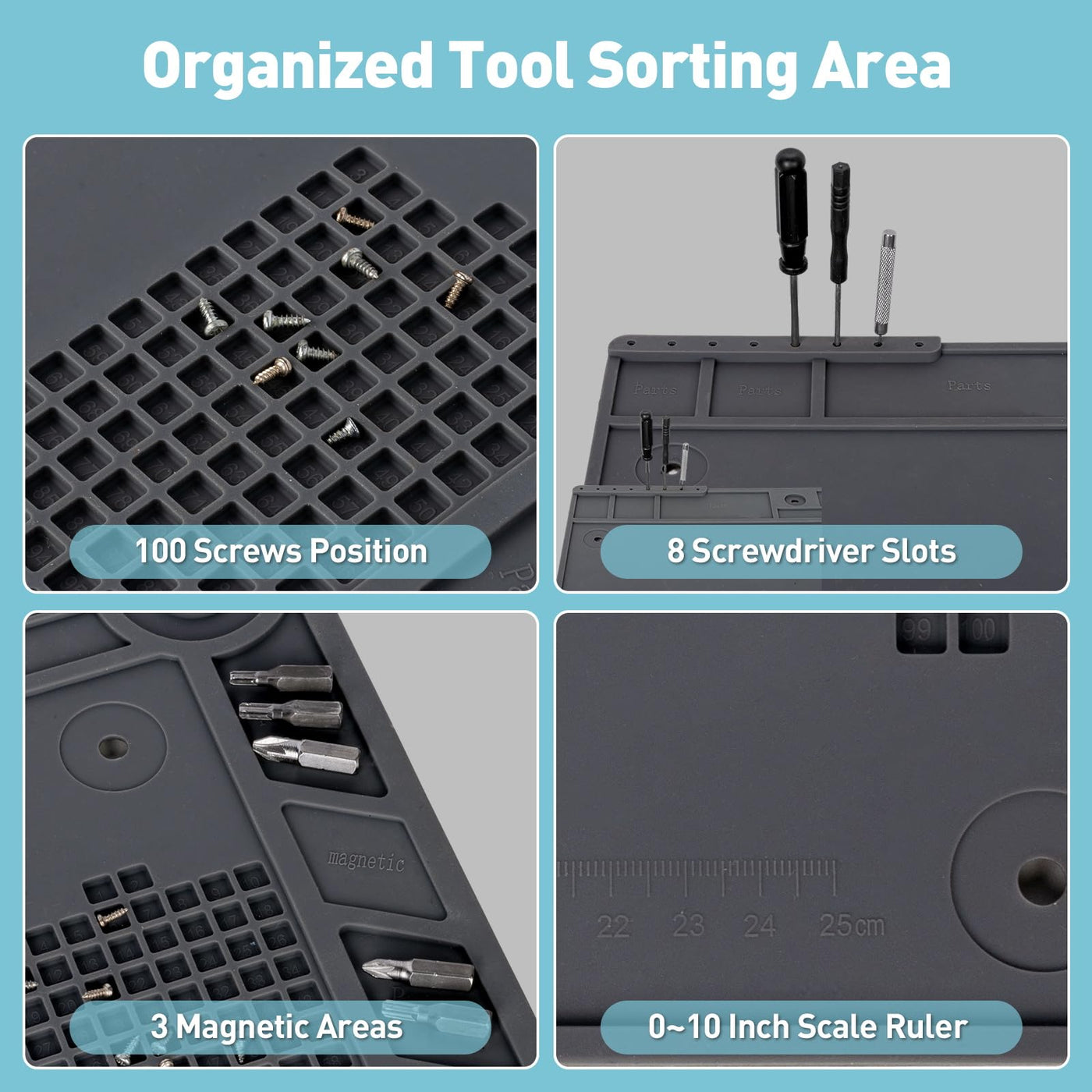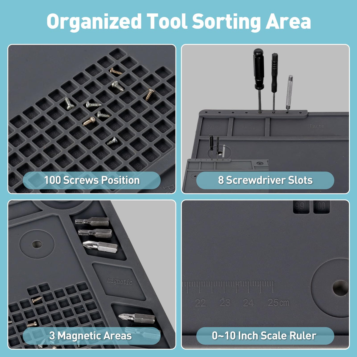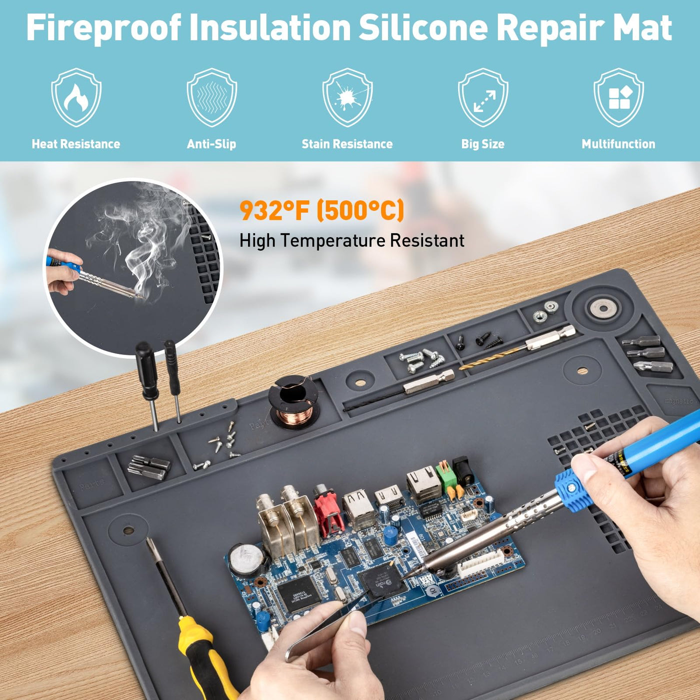 Q: What materials are used in the construction of the soldering station?A: The soldering station features a sturdy base made of heavy metal, a silicone mat that withstands temperatures up to 932°F (500°C), and a magnifying glass crafted from real glass for optimal clarity.