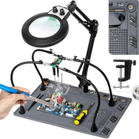 Q: What are the main features of the KUVRS Helping Hands Soldering Station?A: The KUVRS Helping Hands Soldering Station features a 10X HD magnifying glass, a dual knob dimmer for brightness and color temperature adjustment, a heat-resistant working area, and adjustable gooseneck arms with 360° rotating alligator clips for precise positioning.