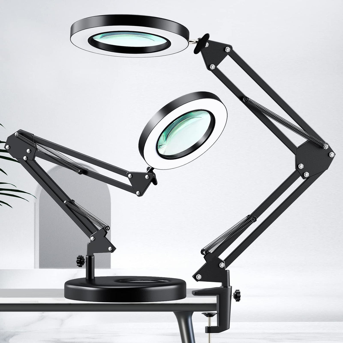 Q: How do I adjust the brightness and color modes on the magnifying lamp?A: The magnifying lamp features a simple control mechanism that allows you to toggle between three color modes (cold, natural, and warm light) and adjust the brightness from 10% to 100%. This customization helps you create the perfect lighting environment for your specific task.