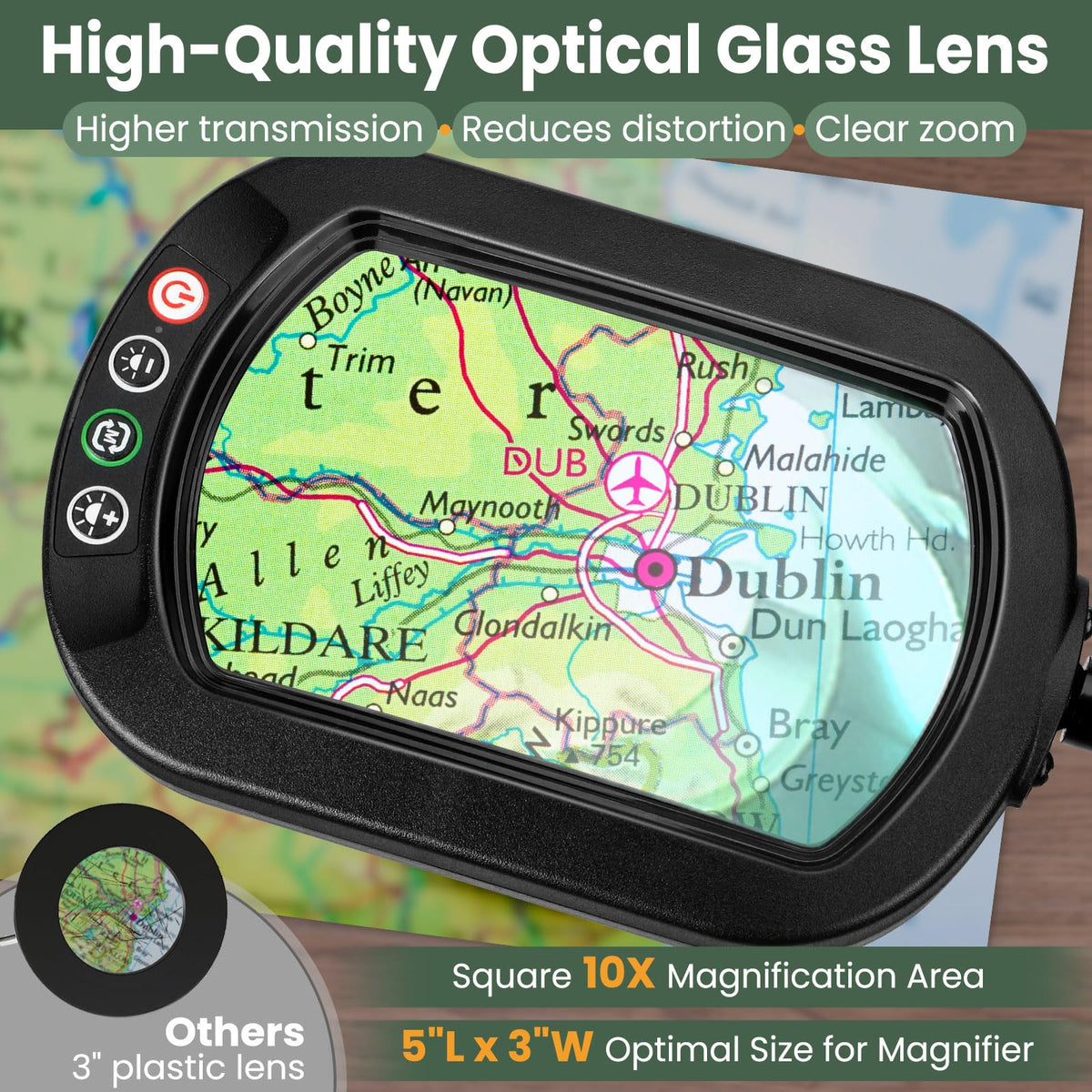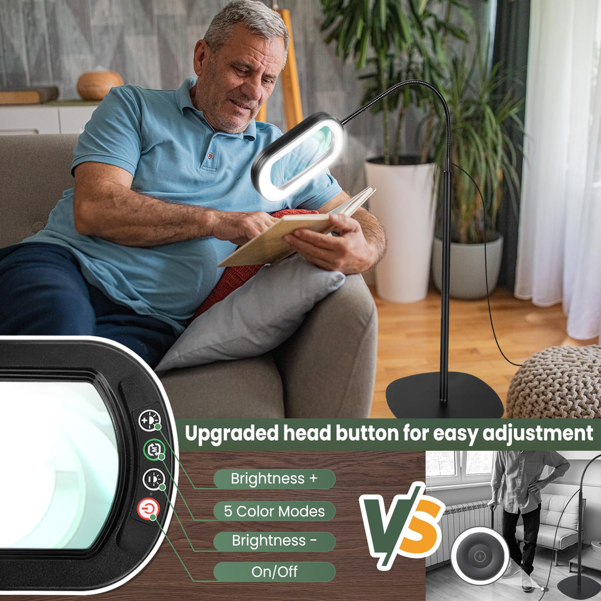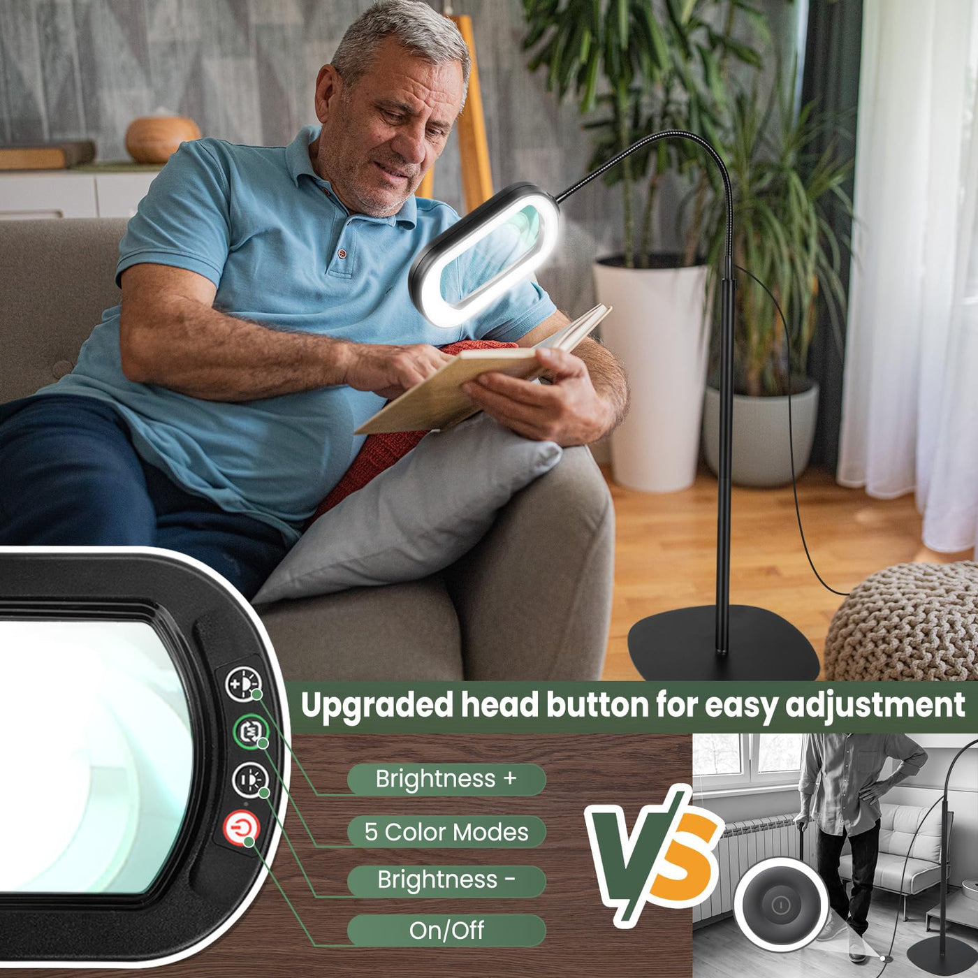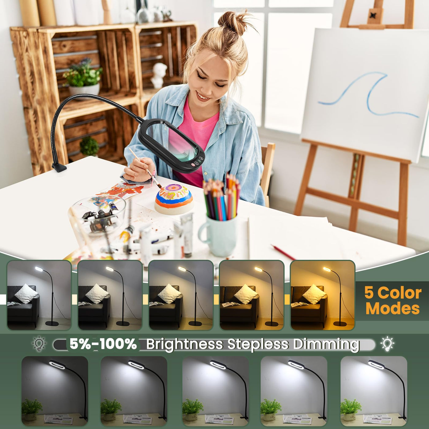 Head Button Control: Easy access to lighting adjustments on the lamp head. 5 Color Modes & Stepless Dimming: Choose the ideal brightness and color temperature, reducing eye strain for extended use. 10X Rectangular Lens: Enhanced magnification with a natural field of view, minimizing distortion and eye fatigue. 3-in-1 Design: Functions as a floor lamp or clamp light, with a stable base and detachable pole for adjustable height. Flexible Gooseneck: 24'' gooseneck and 360 rotating head provide precise positioning for hands-free tasks.