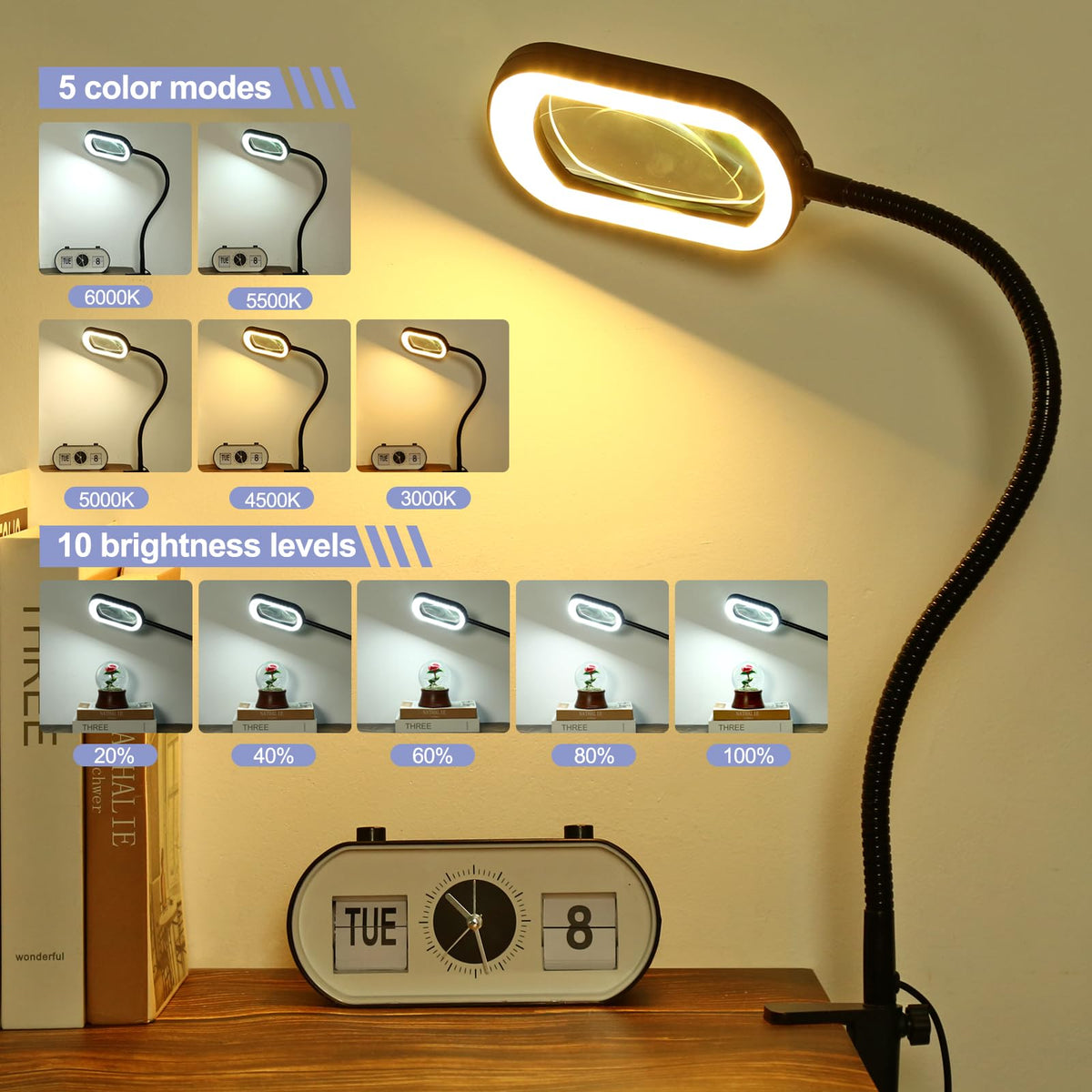 Specifications: Color: Black Magnifying Glass Lens: 4.9X2.9 inches Magnification: 10X Color Temperature: 5 color modes Rating Voltage: 110V-220V Metal Clamp: Max Clip on 2.1 inches desk Package Includes: 1 * Magnifying Glass with Light 1 * Metal Clamp 1 * AC 5V/2A Adapter 1 * User manual The reason for choosing us? 1. Versatile Design: With a hands-free flexible adjustable head, this page magnifying lamp can meet any of your demands, whether you're doing DIY crafts, mechanical circuit repairs, ceramic painting, or intricate detailing. Our eye-friendly magnifying glass lamps provide adjustable powerful LED Lighting, suitable for close-up projects such as stitching, making jewellery, or printing in low-light reading. 2. Designed for professionals and hobbyists alike, this magnifying lamp features premium LEDs, stepless dimming and a clear, large magnifying head to ensure top-notch clarity for tasks such as drawing, embroidery and manicures. 3.Nice Present Choice: Whether it's for the elderly, amblyopia sufferers, macular degeneration patients, retirees, crafters or hobbyists, this magnifying lamp with adjustable stand is a great present choice. Its white and black design adds a touch of elegance to any desk, studio or home office environment. light glass table top desk top swivel button memory function loop solder watch fishing mini small mighty bright