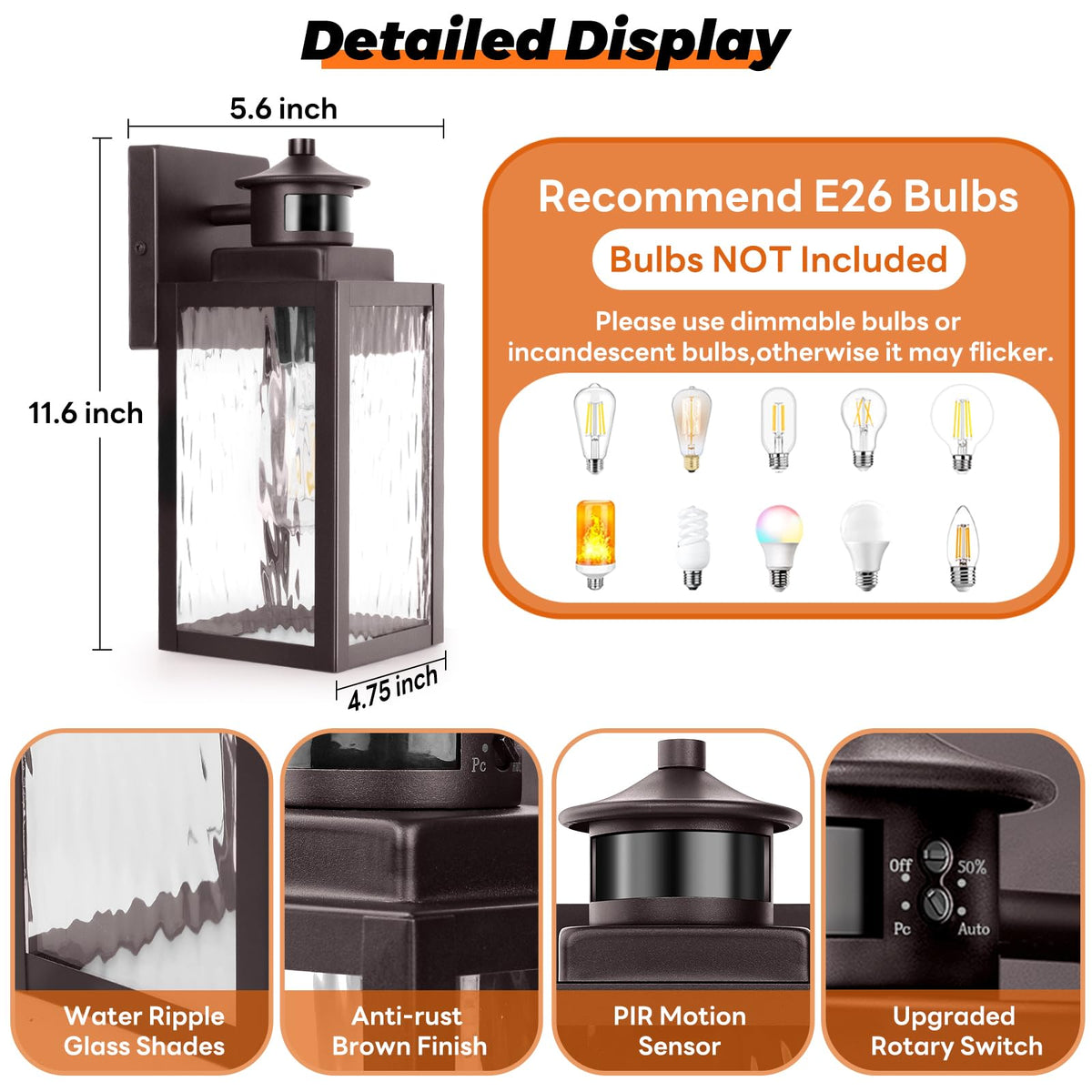 Brightever Motion Sensor Outdoor Wall Light3 Lighting Modeswith Three Lighting Modes To Choose From, These Outdoor Wall Lights Can Cater To Your Specific Needs: ?Dim Mode: Provides You With The Flexibility To Adjust The Brightness From 1% To 50%. After You Have Set The Desired Brightness For The Night, The Brightness Will Reach 100% Upon Detecting Motion, And It Will Return To Your Preset Brightness When No Motion Is Detected. ?Eco Mode: Energy Savings Are Realized By This Mode Automatically Turning Off When No Motion Is Detected.(Note:The Brightness Cannot Be Adjusted) ?Dusk To Dawn Mode: Auto-On At Dusk And Keep 100% Lighting Up Till Dawnnew Version Of Two Rotary Switch For Mode Setting?The Upper Knob For Adjusting The Brightness.?The Lower Knob For Selecting The Lighting Mode.Which Will Be More Convenient And Easy To Get Started Adjusting And Be Handier For All Ages To Operate.Durable Anti-Rust Frame & All Weather-Resistantthese Outdoor Lighting Are Constructed With A Superior Brown Metal Finish And Sturdy Water-Ripple Glass. Furthermore, Featuring Advanced Waterproof Technology, Enabling Them To Withstand Rain And Snow In Extreme Weather Conditions, Which Will Be Long-Lasting With No More Worry Of Getting Rusty Or Corrosion, Providing Additional Safety For Your Home.Easy Installation & Dimmable E26 Bulbs Requiredthe Packaging Includes All Necessary Installation Accessories To Ensure A Swift And Effortless Setup. The Accompanying Standard Sockets Are Fully Compatible With E26 Bulbs (Max 100W). However, Given The Variety Of Brightness Levels Offered By Our Outdoor Wall Sconces, We Recommend Using Either Incandescent Bulbs Or Dimmable Bulbs To Cater To Your Personal Preferences.Specifications:Bulb Base: E26 / E26Special Feature: Motion Sensormaterial: Metal+Water-Rippled Glass