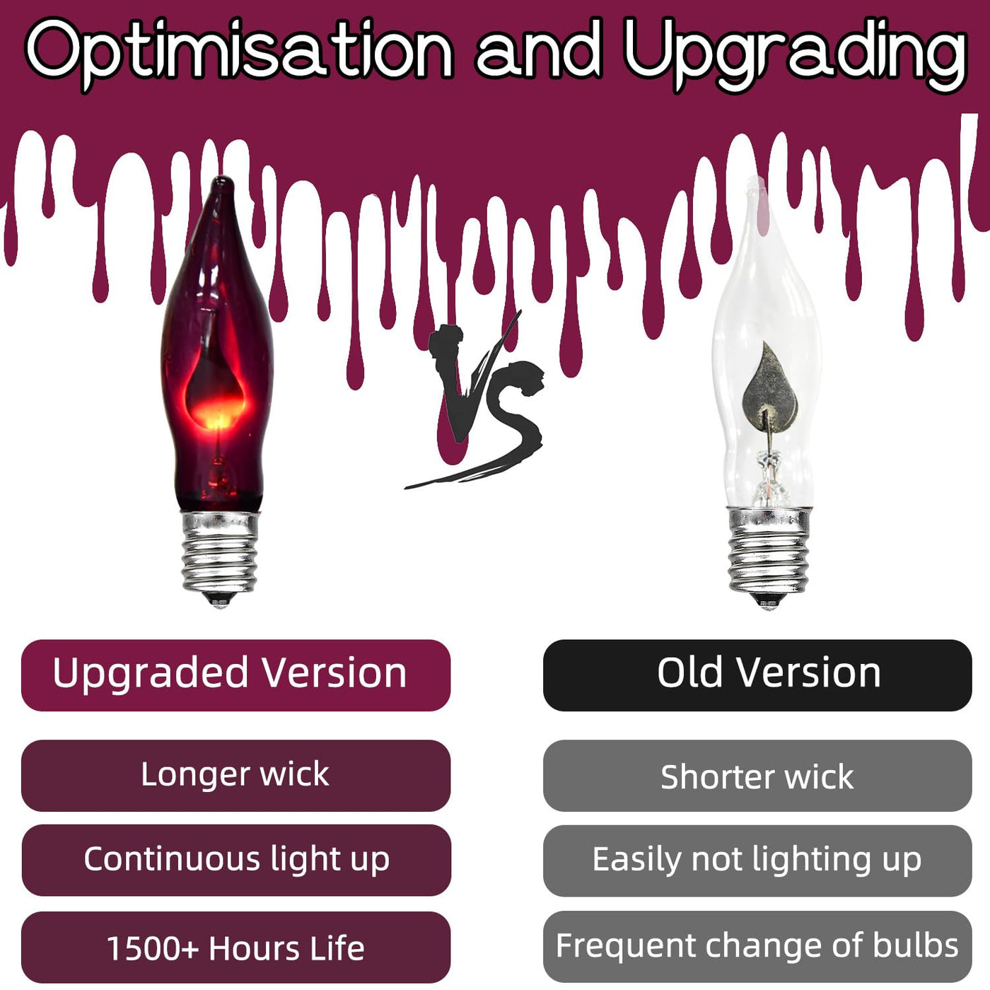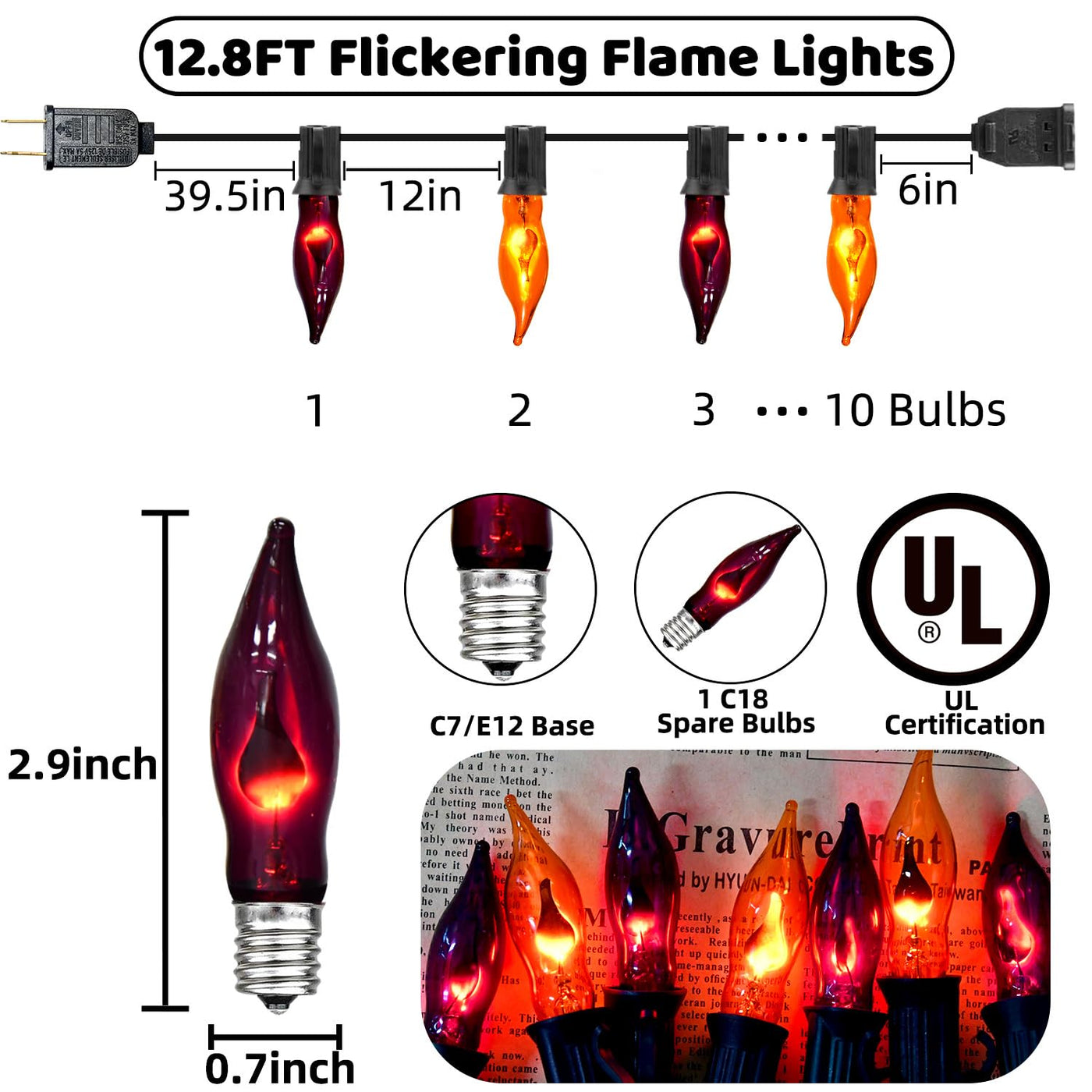 Packaging includes 12.8Ft Clear Orange and Purple Flickering Flame String Lights with 12 Pack Clear C7 Flame E12 Light Bulbs 2 Spare C18 Bulbs