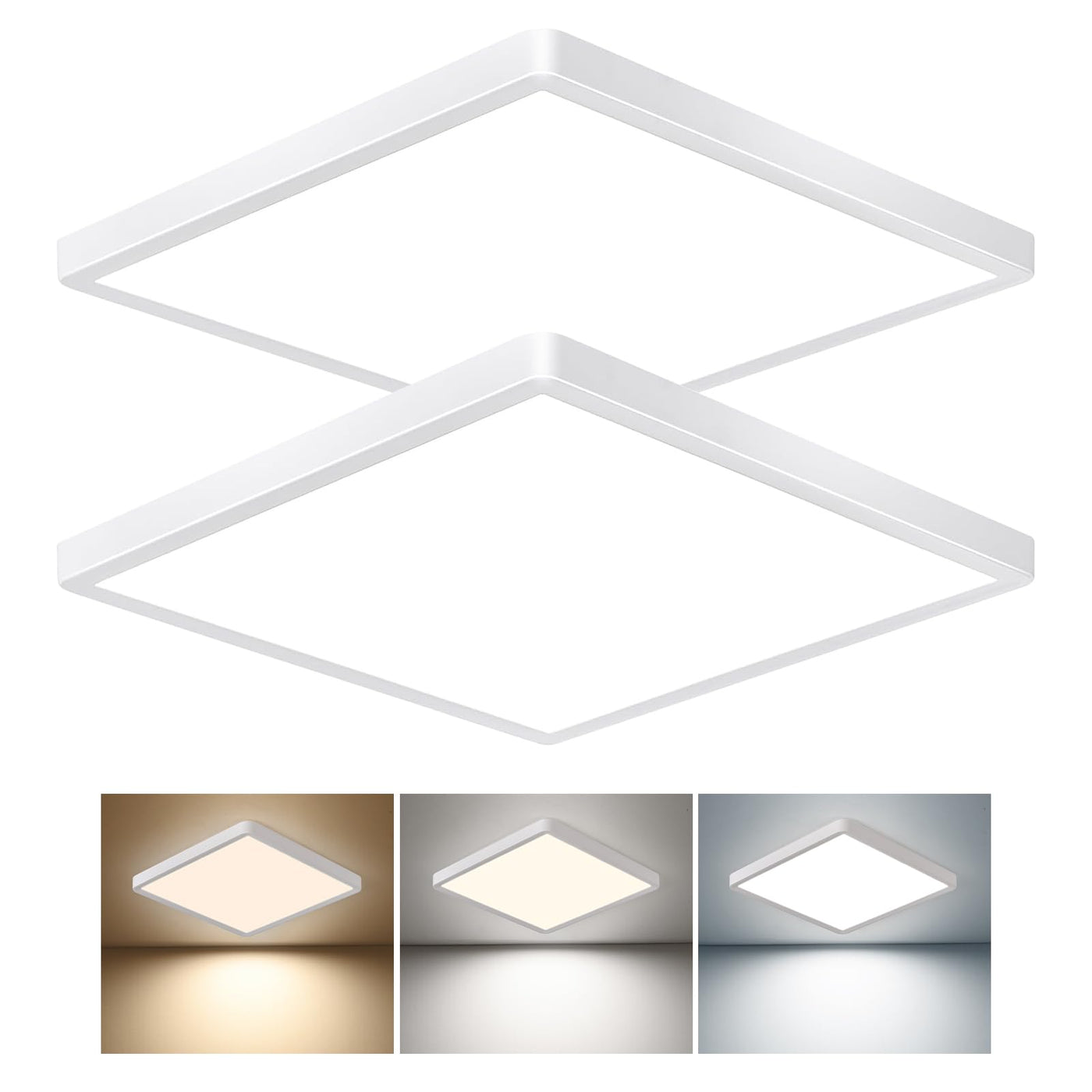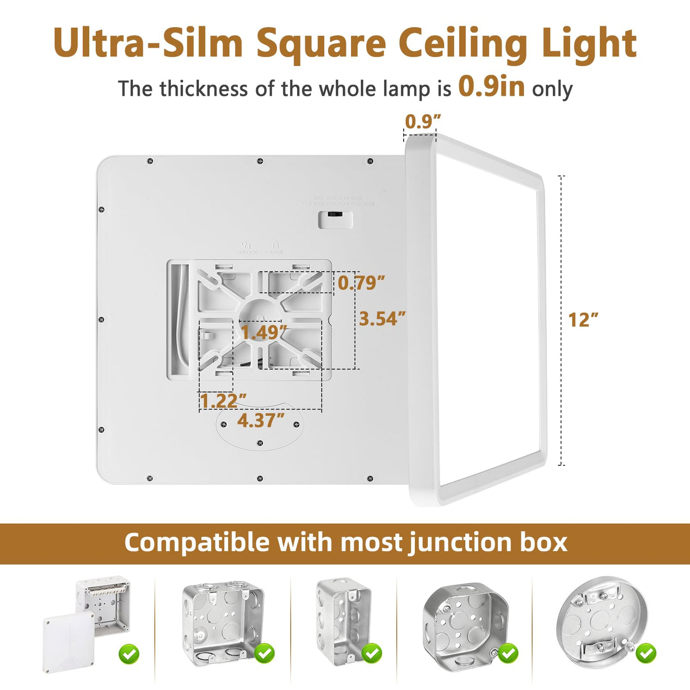 Q: What color temperatures are available for the 12 Inch Square Flush Mount Ceiling Light?A: This ceiling light offers three selectable color temperatures: 3000K (Warm White), 4000K (Neutral White), and 6000K (Daylight White), allowing you to choose the perfect ambiance for your space.