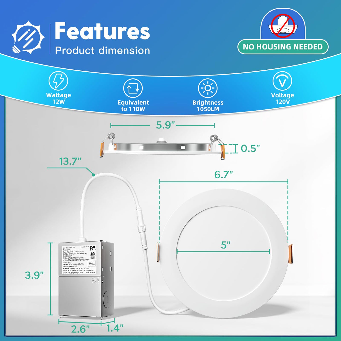 12 Pack 6 Inch 5Cct Ultra-Thin Led Recessed Ceiling Light With Junction Box, 2700K/3000K/3500K/4000K/5000K Selectable, 1050Lm Brightness, Dimmable Canless Wafer Downlight, 12Weqv110W, Etl&Fcc