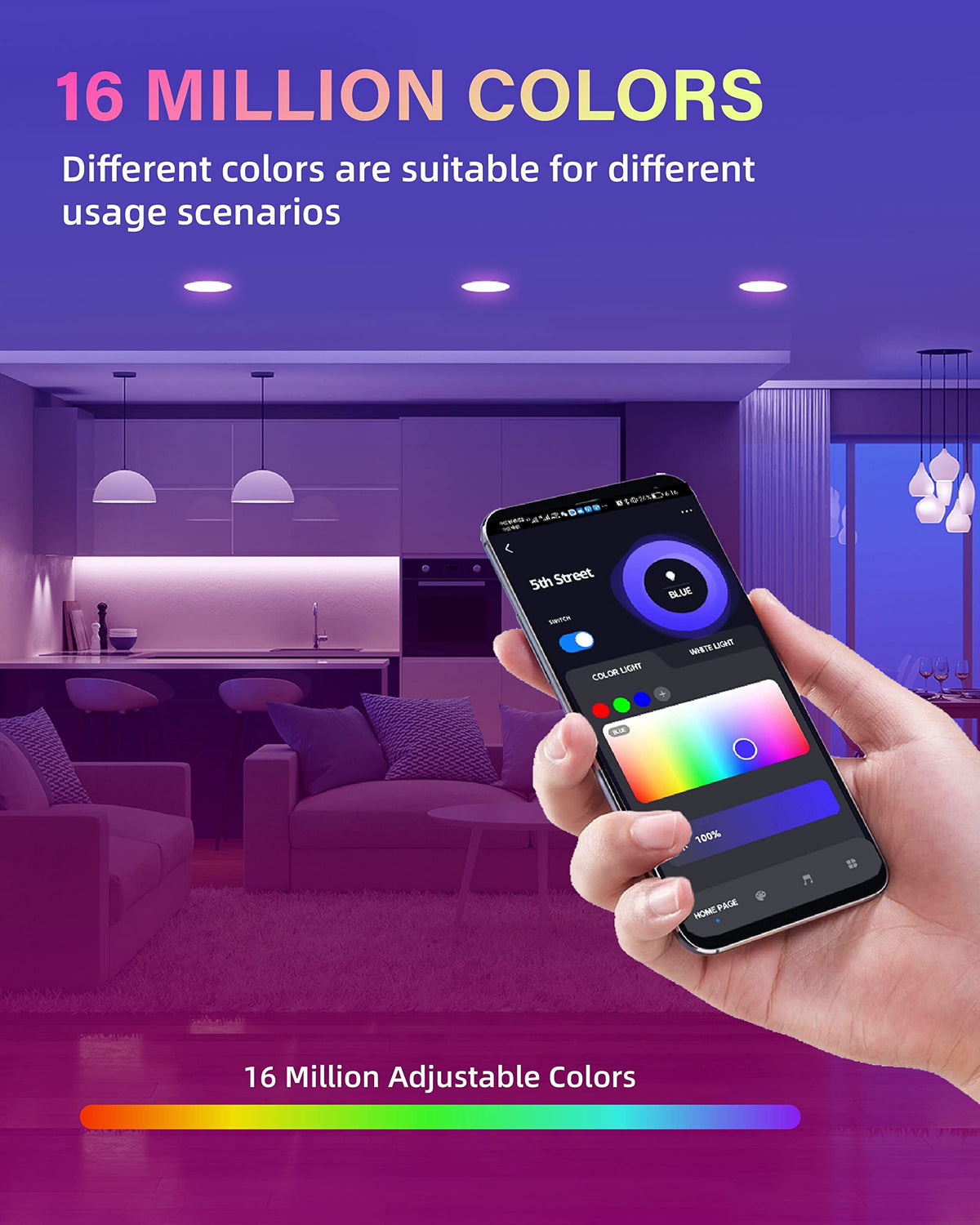 Q: What color temperature options are available for these recessed lights?A: The 6-inch smart recessed downlight offers a variety of color temperatures ranging from warm white (2700K) to cool white (6000K), along with 16 million color options for customizable ambiance.