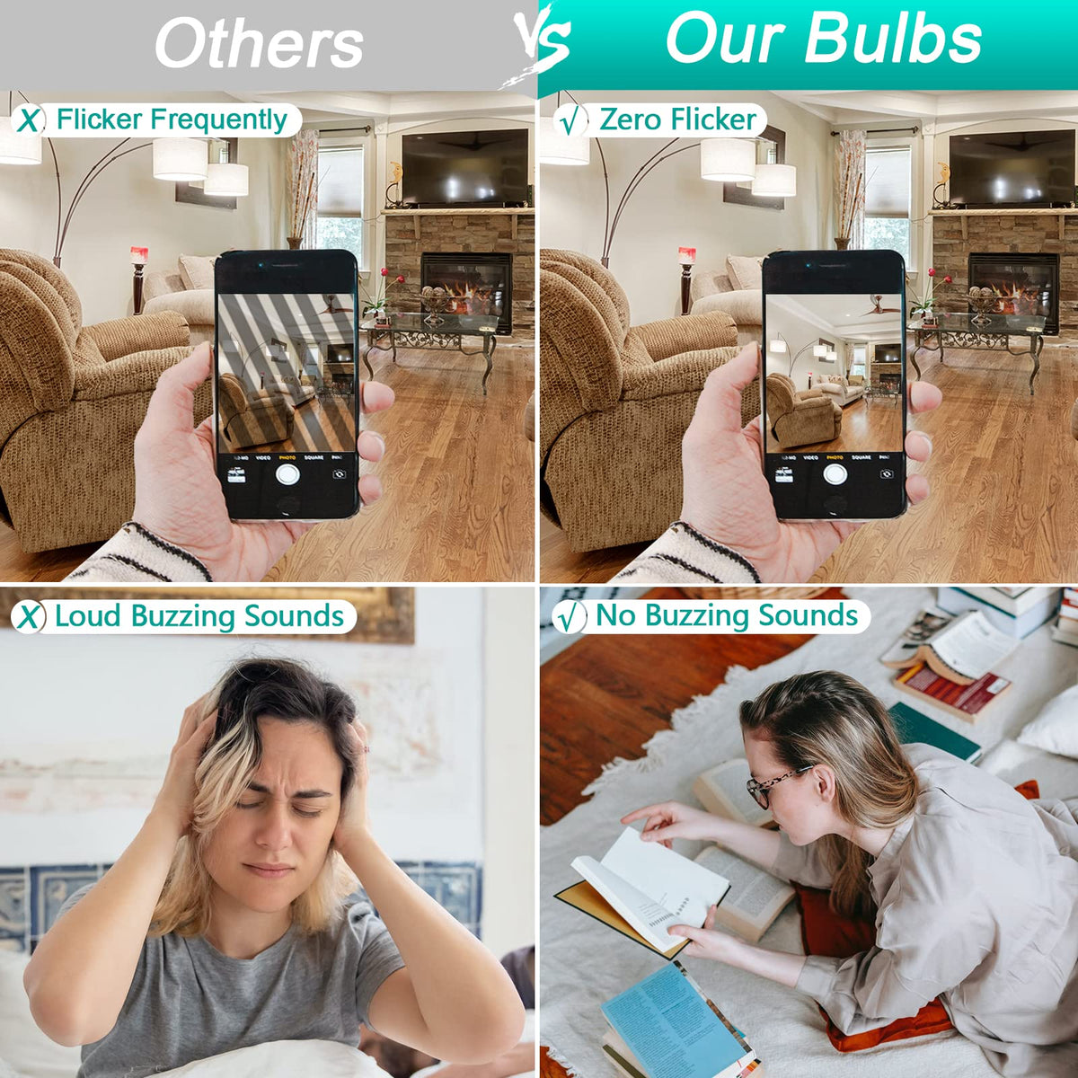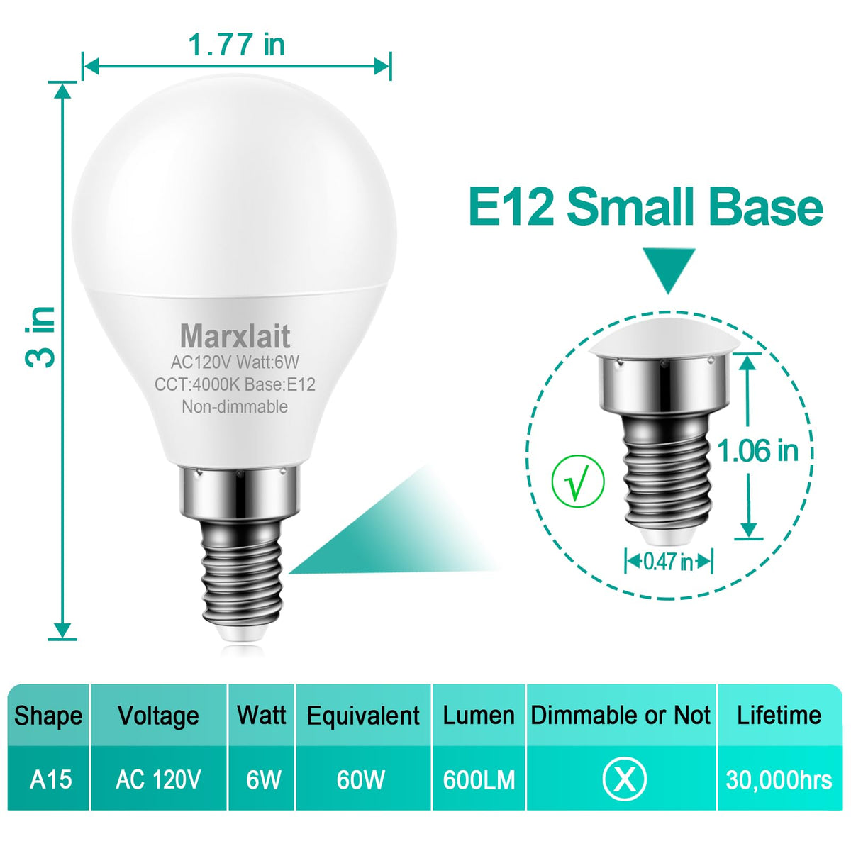 Specification: Voltage: AC120V Wattage: 6W Equivalent: 60W Lumen: 600LM Color Temp: 4000K Natural Daylight Base: E12 small base Size: dia 1.77'', height 3'' Color rendering index: >80 Dimmable or not: No Waterproof or not: No Package: 12 Pack Note: 1. Turn off the power supply before installation. 2. Do not use this bulb with dimmers. 2. Indoor use only. Keep away from rainwater leaching.