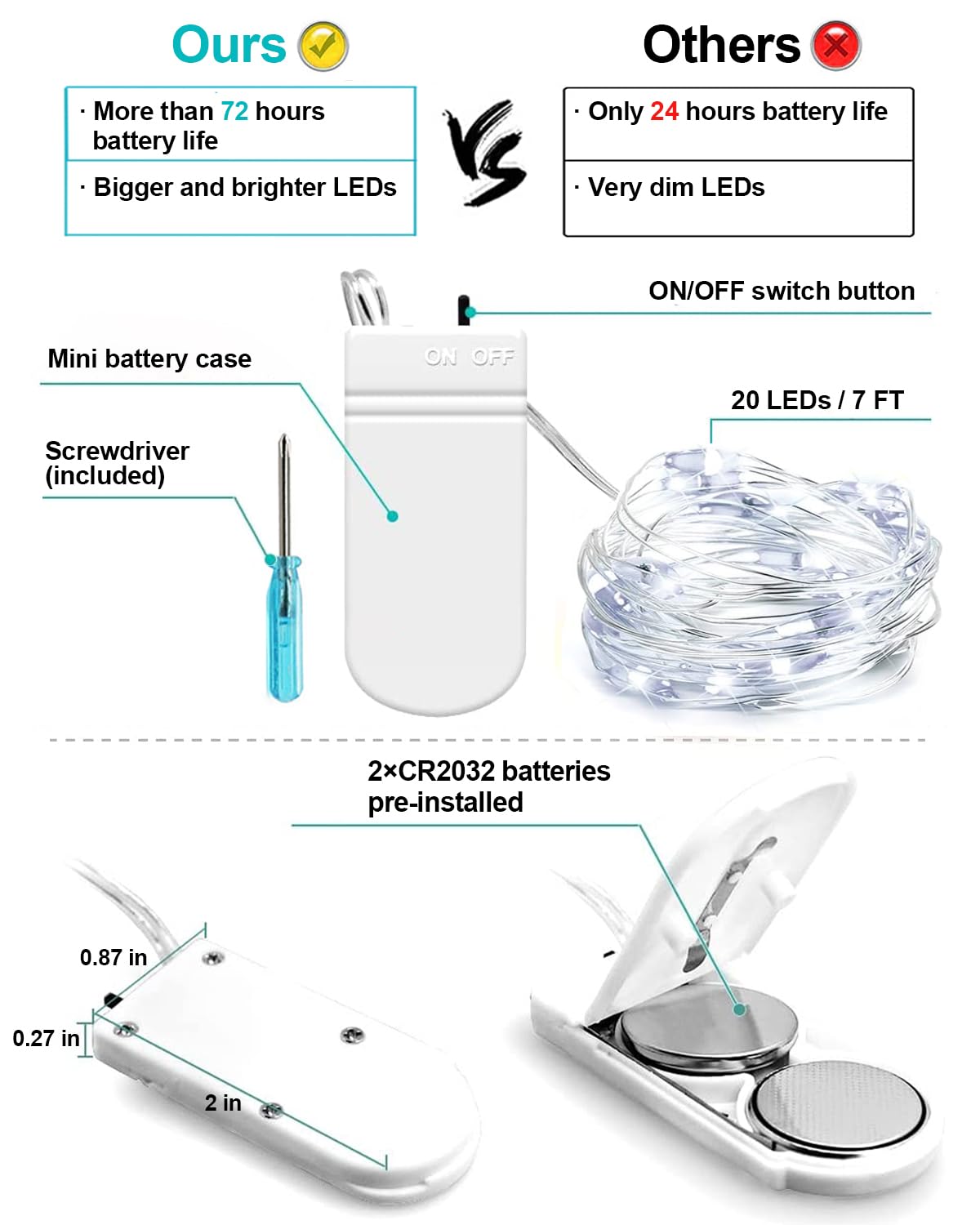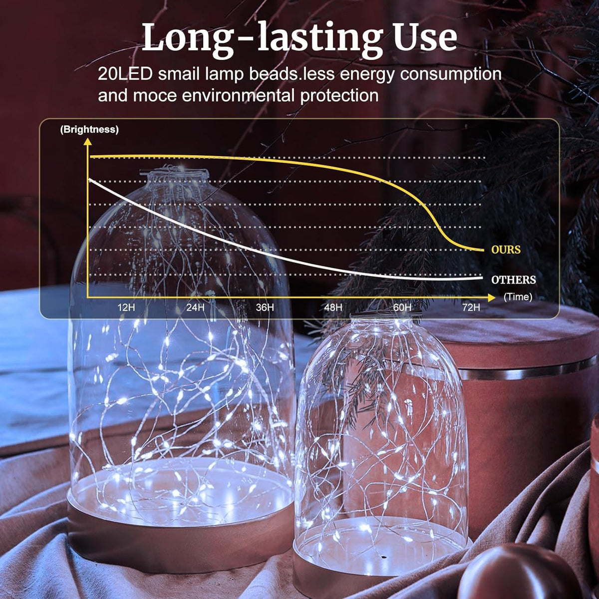 Q: How long do the batteries last in the 12 Pack Fairy Lights?A: The batteries in the 12 Pack Fairy Lights provide long endurance lighting for more than 72 hours, ensuring you can enjoy a beautiful ambiance for extended periods without frequent replacements.