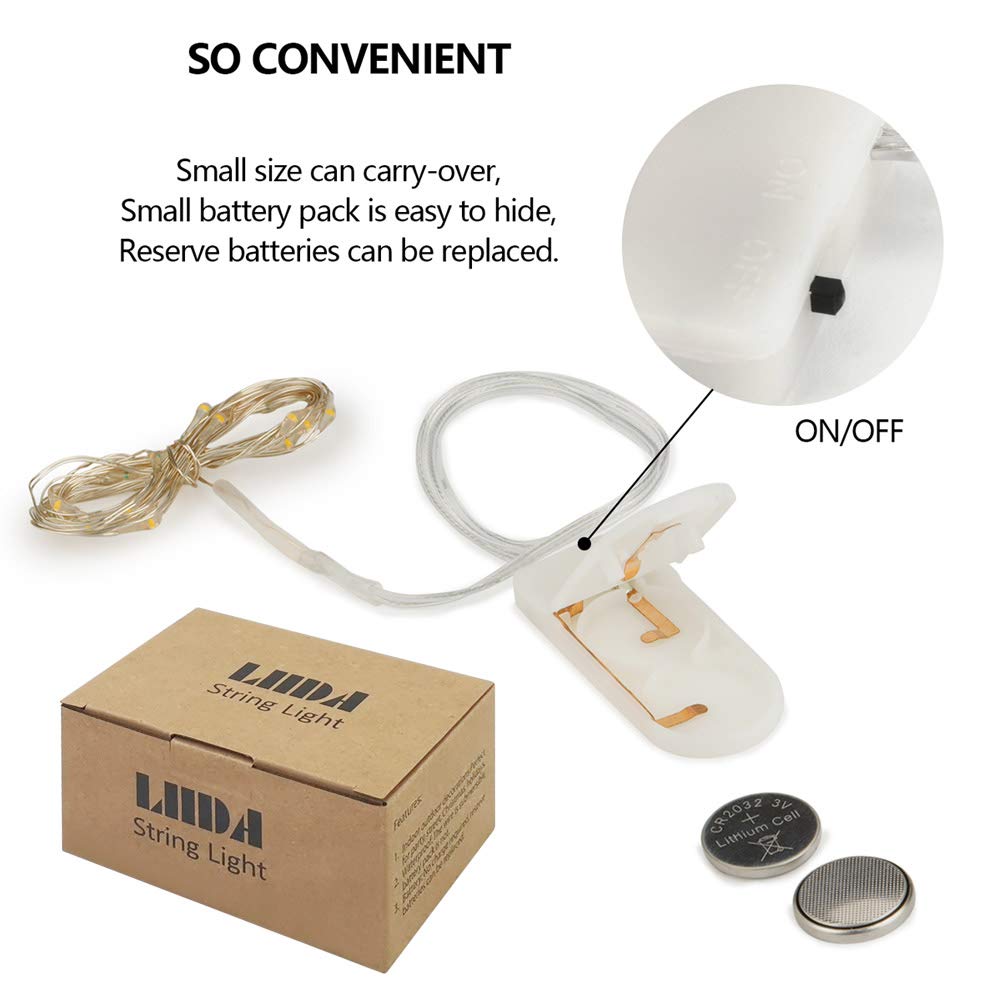 - Powered by 2 x CR2032 batteries (included) , the mini battery pack (2X0.87 inches)is super easy to operate and hide -- Last up to 72 hours for constant use(triple long than others') and will be longer if use with breaks Safe to touch - The voltage of each battery is only 3V , so the lights are almost no heat,which are very safe to touch , you can place them anywhere you like , your bed ,your wedding centerpiece, your mason jars and so on