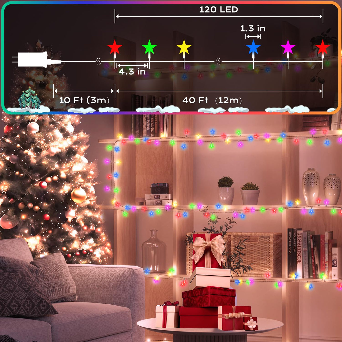 Q: What is the length of the string lights and how far apart are the bulbs?A: The 120 LED Star String Lights are 40 feet long, with each star-shaped bulb spaced 4 inches apart. This length provides ample coverage for both small and large areas, making it versatile for various decorating needs.