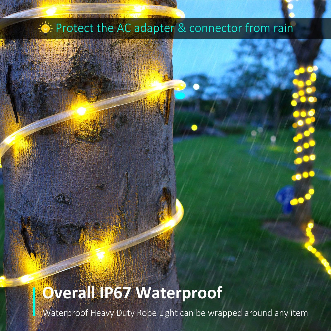Q: What materials are used in the construction of these rope lights?A: The rope lights are made from high-quality polyvinyl chloride (PVC), which is durable and flexible. The thicker 11.3mm diameter tubing provides superior protection for the LEDs, ensuring long-lasting performance.