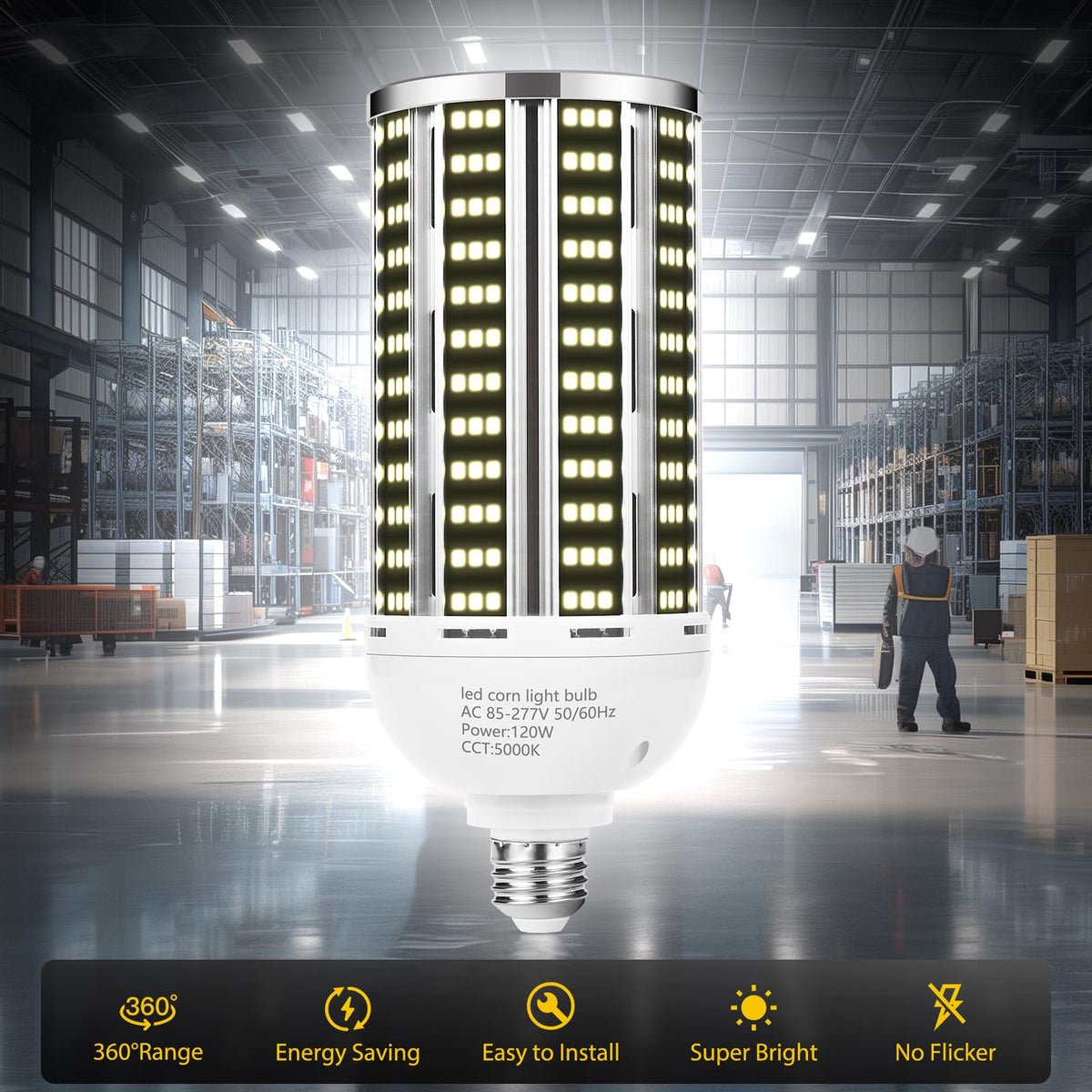 Yanycn Led Corn Light Bulb: 1. High Quality Led Chips,Heat Control System And Cooling Structure Design, Lead To Longer Usage Lifespan: Over 55,000 Hours; 2. 85+ Cri(Color Rendering Index) Make Colors Appear As They Really Are. See All Color The Way They Are Supposed To Be Seen 3. 85-277V Us Stantard Power,Overheating Of Led Driver Is The Main Cause Lead To Light Failure. Our Strong Isolated Led Driver Ensure The Stability And Long Lifespan 4. Strong Aluminum Heat Sink Protected. 360 Beam Angle Lighting More Bright,Fanless Design, Fast Heating Dissipation. No Worries For Application Within Both Wild Open Or Totally Enclosed Luminaries 5. High Quality Led Chip Create A Stunning 15900 Lumens Brightness Output,Bright As A Small Sun Applications Scenes: Fit Both Us Regular And Large Mogul Screw-In Base Fixtures,Widely Used At Home,Garage,Basement,Storehouse,Driveway,Supermarket,Office,Gas Station,Warehouse,Barn,Yard,Supermarket,Facotry,Parking Lots,School,Hospital,Street Light,Showroom,Gym Wherever Needs Sufficient Lighting Specifications(Single): * Luminous Power: 120W; * Color: 5000K/Daylight; * Input Voltage: Ac 85V-277V / 50-60Hz; * Lumen Efficacy: 150Lm/W * Socket: E26/E39 * Beam Angle: 360 Degrees; * Material: Aluminum + Pc; * Working Environment:-4~+113?; Attention: Switch Off The Power Before Replacing The Bulb Bypass The Ballast For Mhl/Hid/Hps Replacement This Bulb Is Non Waterproof This Bulb Is Non-Dimmable Do Not Stare At The Light When It Is Working Package : -2Pcs X 120W Led Corn Light Bulb Thank You