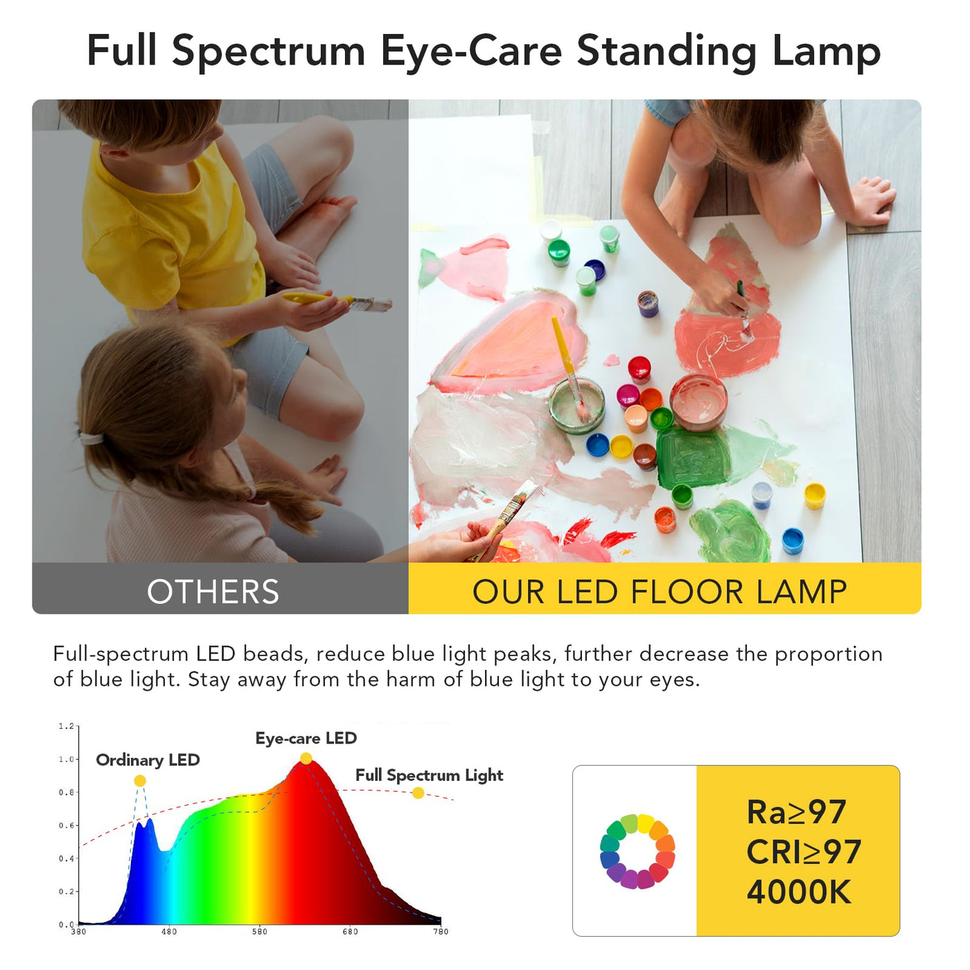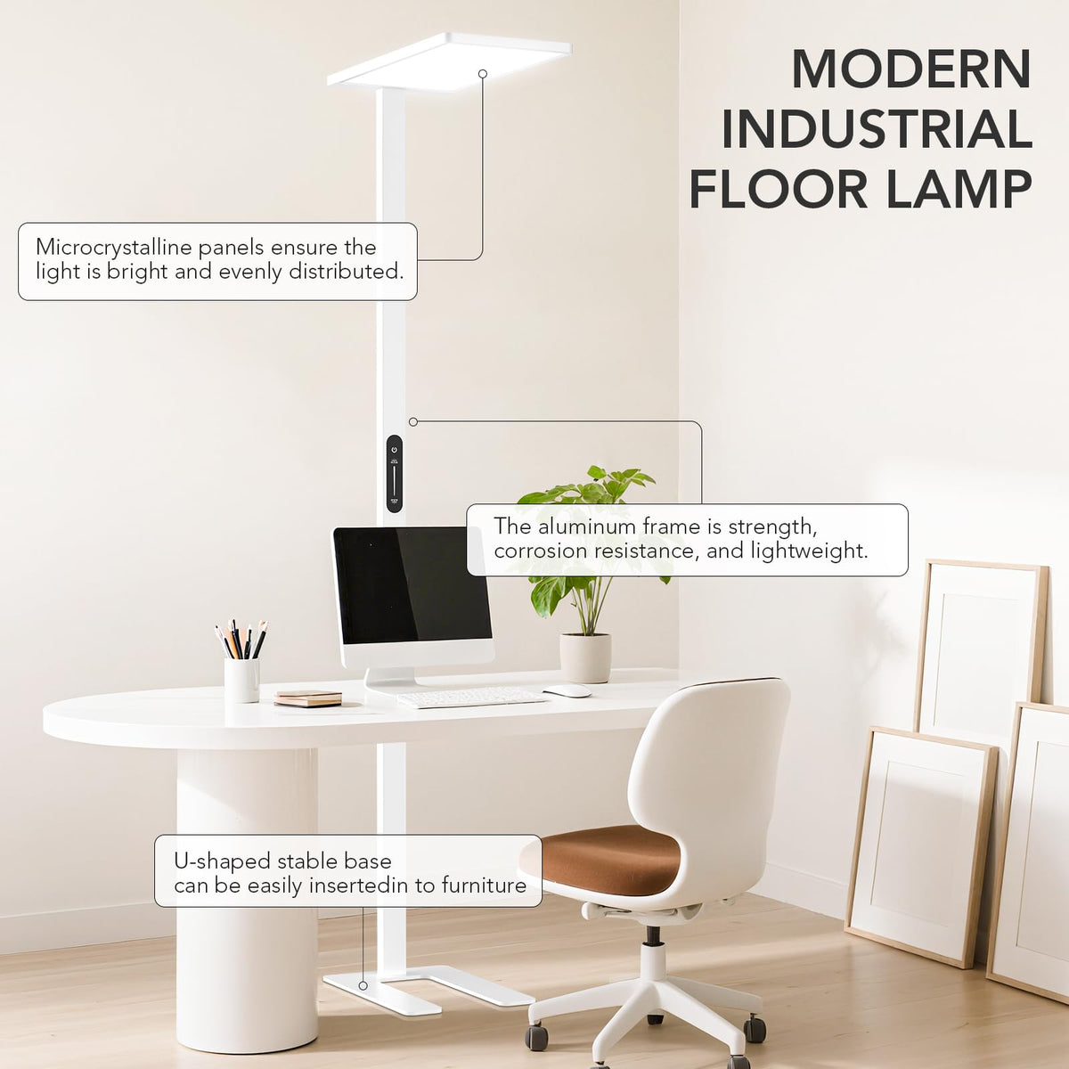 Dual Light Sources for Versatile Illumination: Experience comprehensive lighting with STERREN floor lamp, featuring upper 70W and lower 50W light sources. The 4000K color temperature is like the morning light at 10:00 GMT, perfect for various activities such as reading, working, or practicing piano. Let your study, office, studio and piano room have perfect natural daylight lighting. | Full-Spectrum Eye-Care Standing Lamp: Adopting full spectrum lighting technology, it mimics natural daylight and reduces blue light exposure to promote vision health. The micro-prism diffusion plate illuminates the entire space with soft light, reduces the direct glare. Whether youre engrossed in a book or focusing on detailed work, this led floor lamp ensures comfortable and fatigue-free vision. | Touch Dimming Office Floor Lamp: The touch panel offers unparalleled flexibility, just a tap can bright your world. Both the upper and lower lights can be controlled independently, and touch the slide dimmer to your preferred brightness levels, offering unparalleled customization lighting. The memory function ensures your last setting is retained, offering convenience each time you turn on the reading lamp. | Stable Base without Shaking : Modern free-standing lamp with ultra thin 0.3in U-shaped stable base can be easily inserted into the edge of the desktop to save space. Positive 15