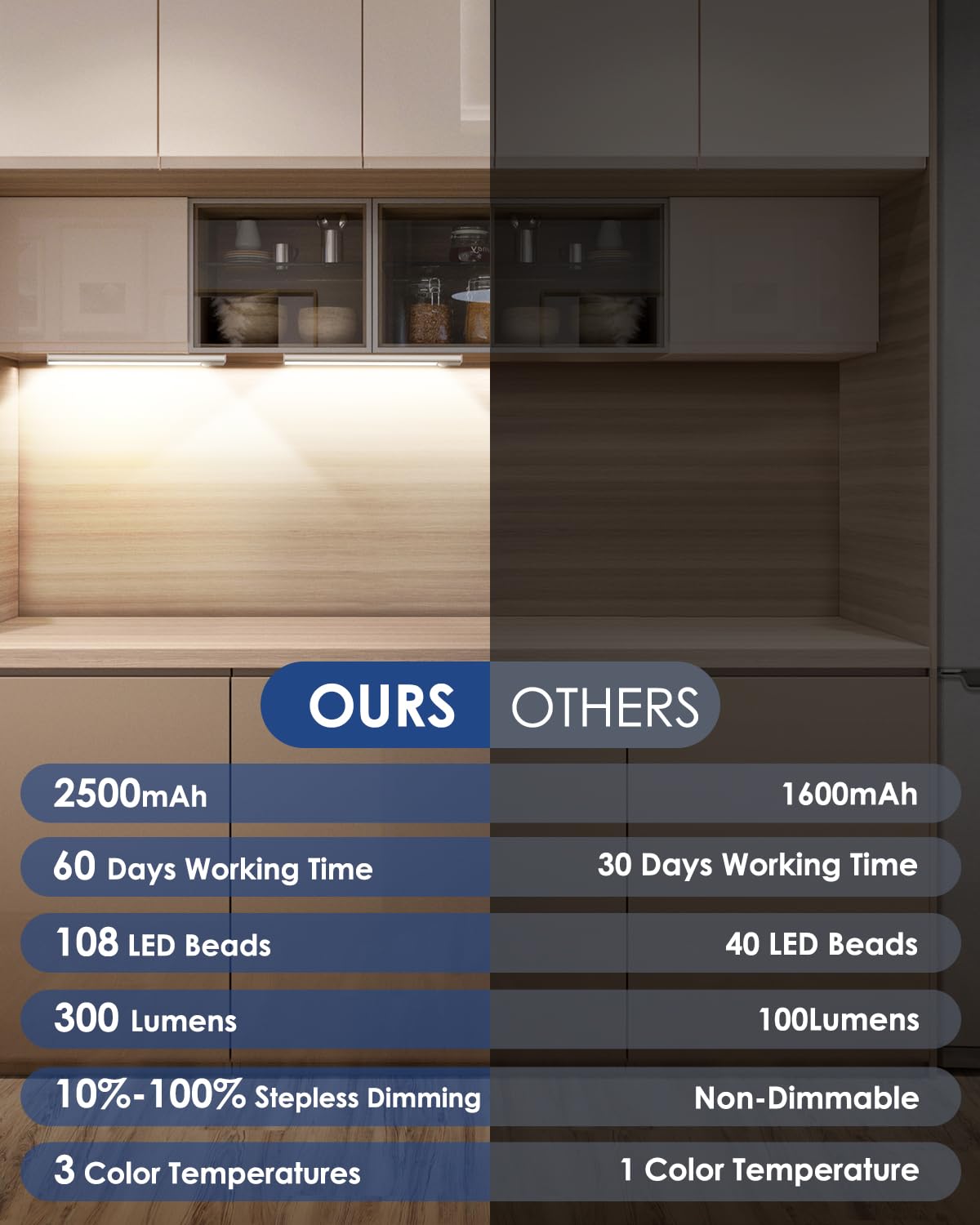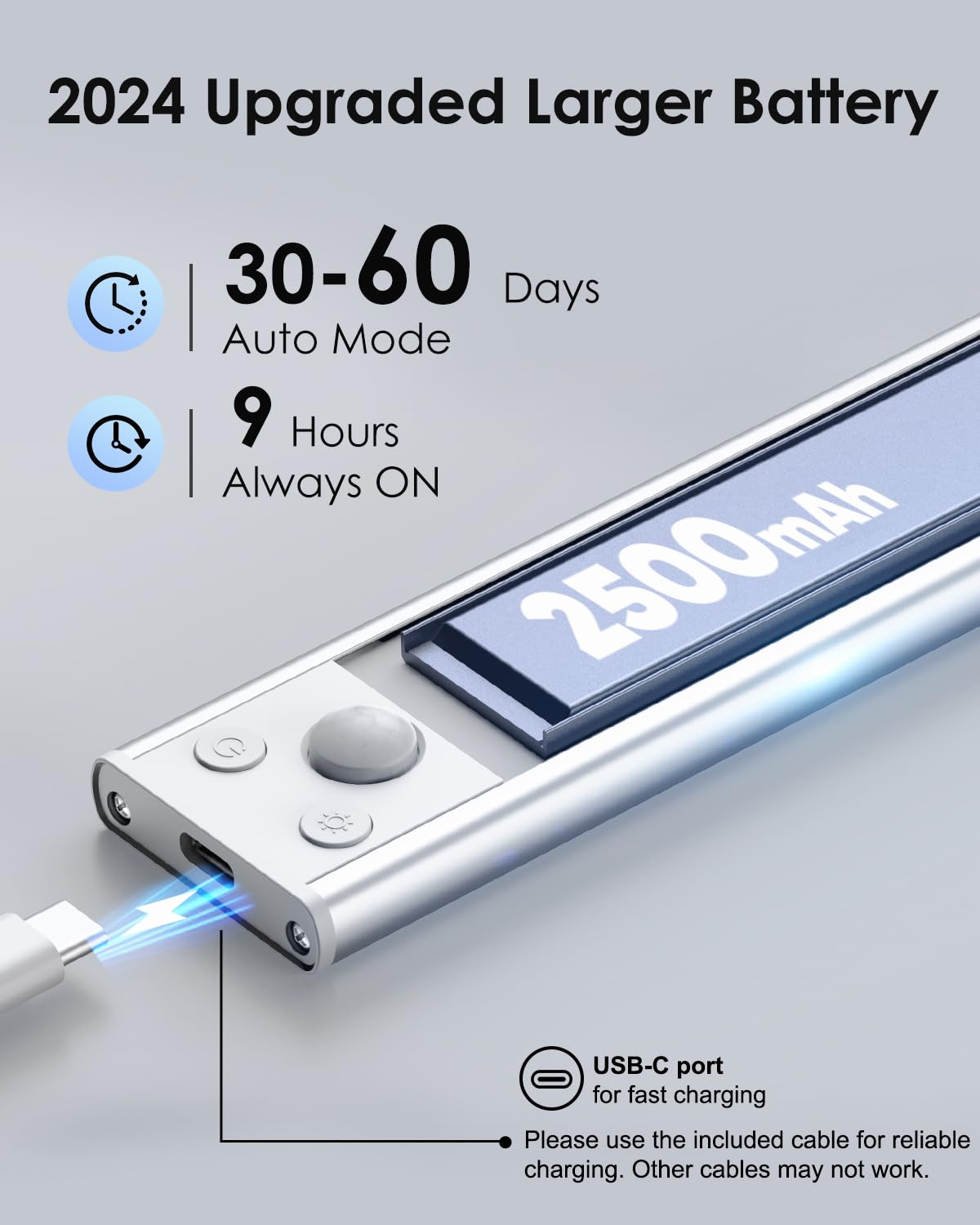 Q: How long does the battery last on the 12in Under Cabinet Lighting?A: The 12in Under Cabinet Lighting features a powerful 2500mAh rechargeable battery that can last up to 60 days in Auto mode and up to 9 hours in Always-On mode, ensuring reliable and long-lasting performance.