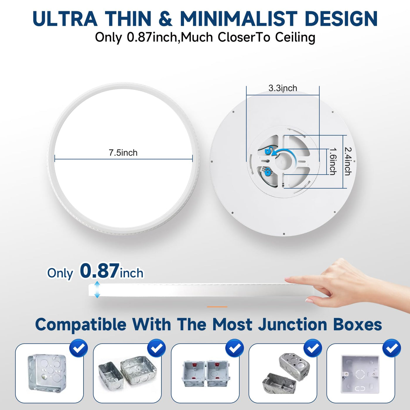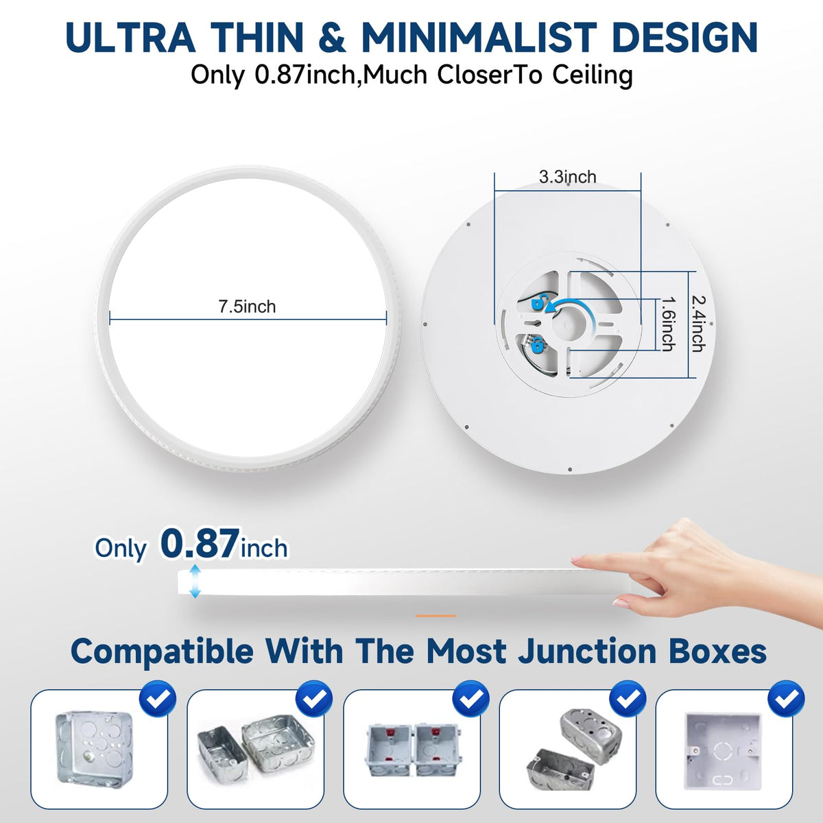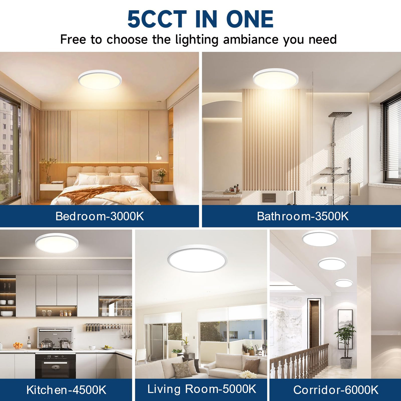 Q: What are the color temperature options available for the 12Inch Dimmable LED Ceiling Lights?A: The 12Inch Dimmable LED Ceiling Lights offer five color temperature settings: 3000K, 3500K, 4500K, 5000K, and 6000K. This range allows you to choose from warm white to daylight, catering to different lighting needs and preferences.