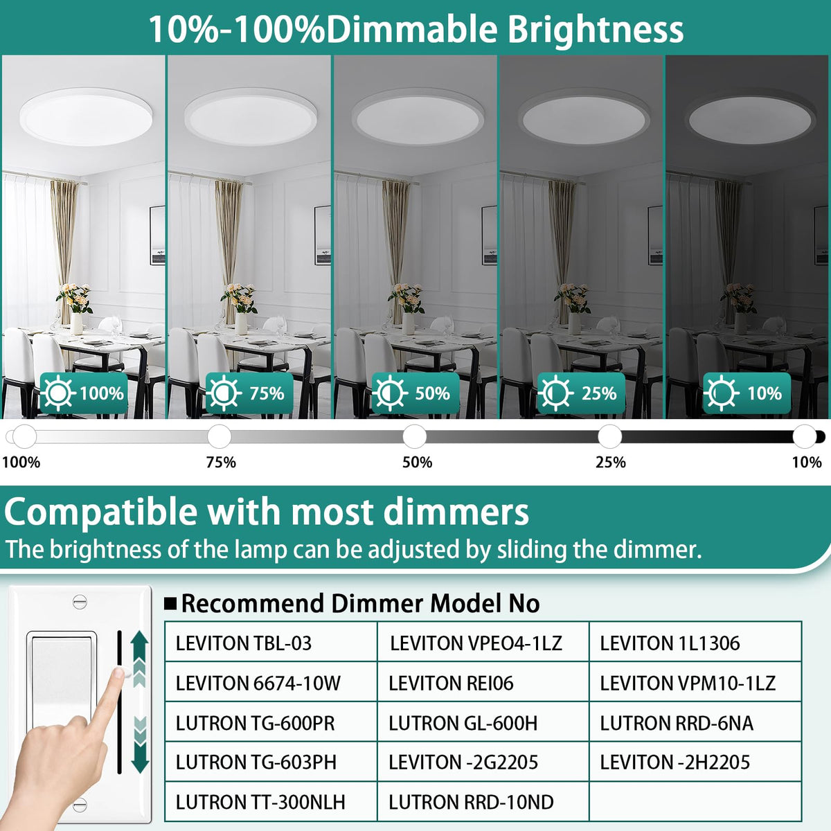 Q: Can this LED ceiling light be dimmed?A: Yes, the LED flush mount light fixture is compatible with most dimmer switches, allowing you to adjust the brightness according to your needs. Please note that a dimmer switch is not included with the product.