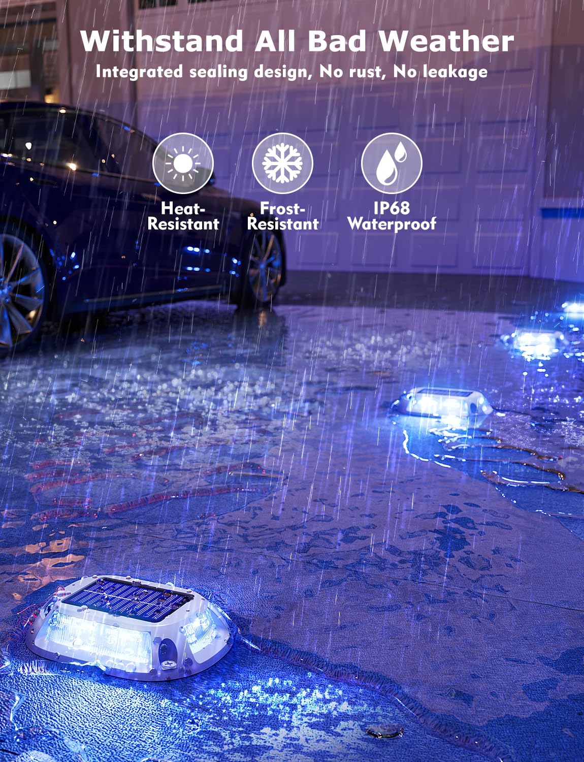 Q: Are the solar driveway lights waterproof and durable?A: Yes, the 12Modes Solar Driveway Lights are IP68 waterproof, meaning they can withstand extreme weather conditions, including heavy rain and snow. Made from sturdy aluminum alloy, they are also pressure resistant and can bear the weight of vehicles up to 20 tons.