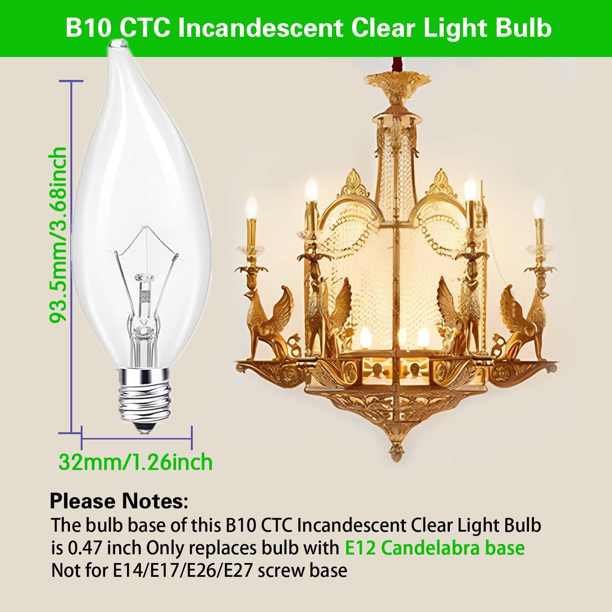 Q: What type of base do these light bulbs use?A: These light bulbs feature a standard E12 candelabra base, making them compatible with most chandeliers and decorative lighting fixtures.
