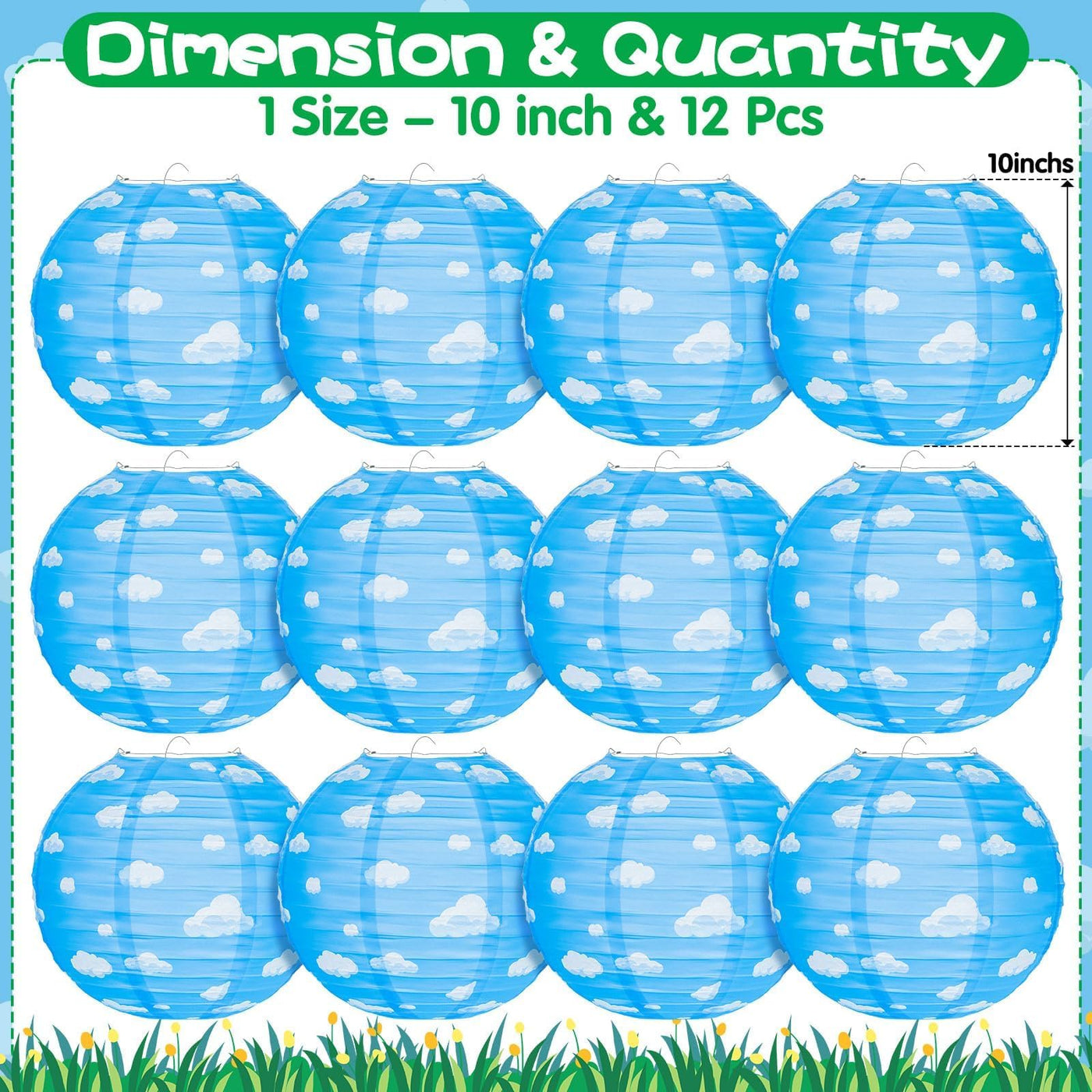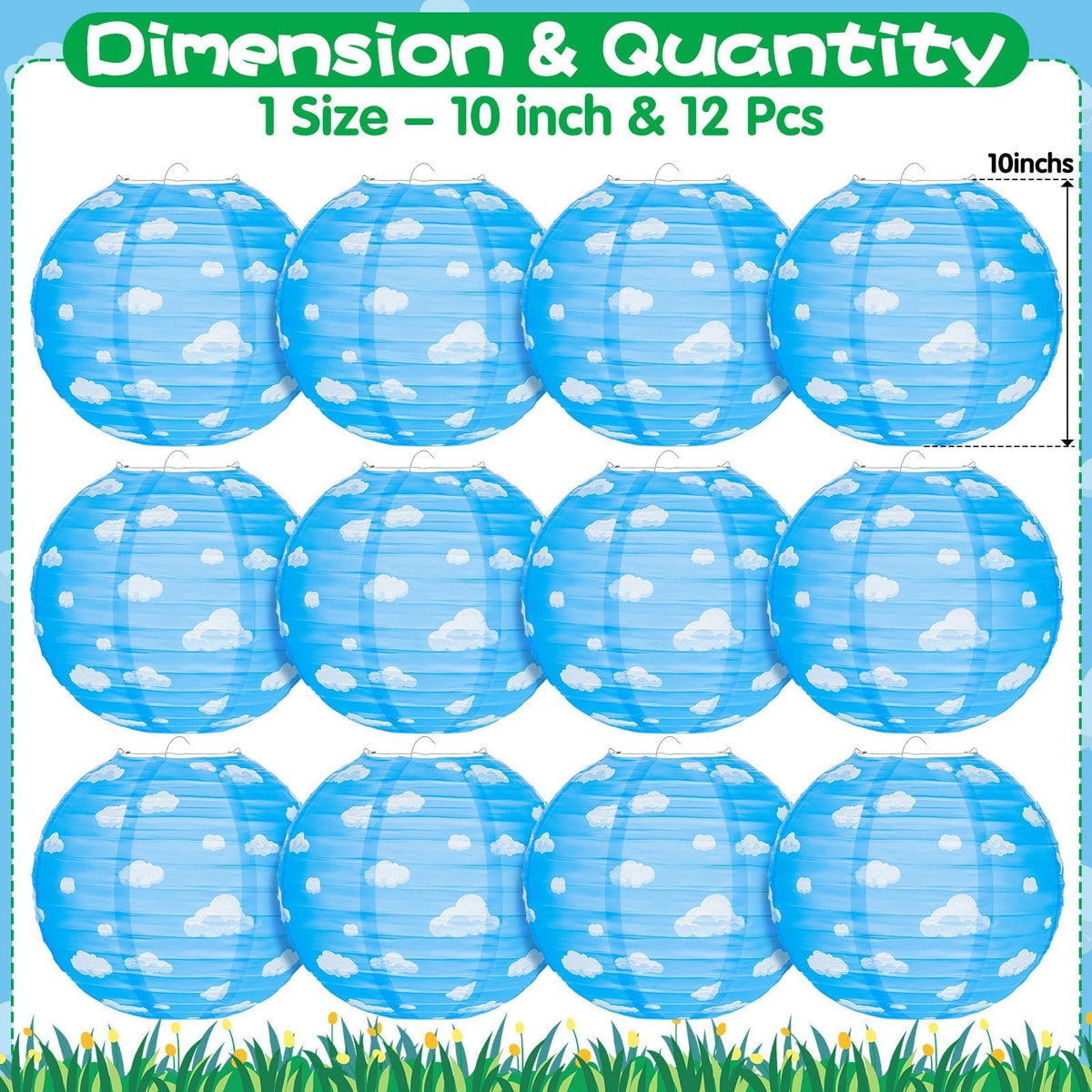 Blue Sky White Clouds Paper Lanterns Set Comes With 12Pcs Paper Lanterns To Hang Up In Your Party. Unique Blue Sky White Clouds Pattern Design, Like Clouds Are Floating In The Blue Sky. These Paper Lanterns Are So Eye-Catching, And Will Be Loved By Kids !Wide Range Of Uses:Blue Sky White Clouds Paper Lanterns Are Ideal For Blue Party, Baby Shower, Birthday Party, Home Decorations And Coluds Theme Parties!How To Use:1. Take Out The Lantern And Metal Frame;2. Carefully Expand Thelantern;3. Lnsert The Metal Frame From The Top Into The Lantern And Fit The Metal Frame With Two Top Rings;4. The Blue Sky White Clouds Paper Lanterns Finished;