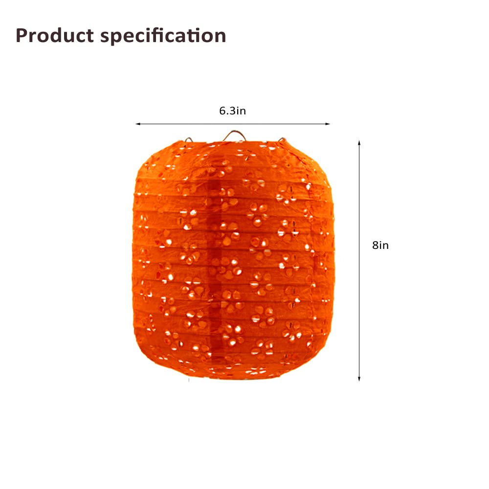 Q: What are the dimensions of the 12PCS Hollow Paper Lanterns?A: Each paper lantern measures 6 inches in diameter and is oval-shaped, making them ideal for various decorative uses.