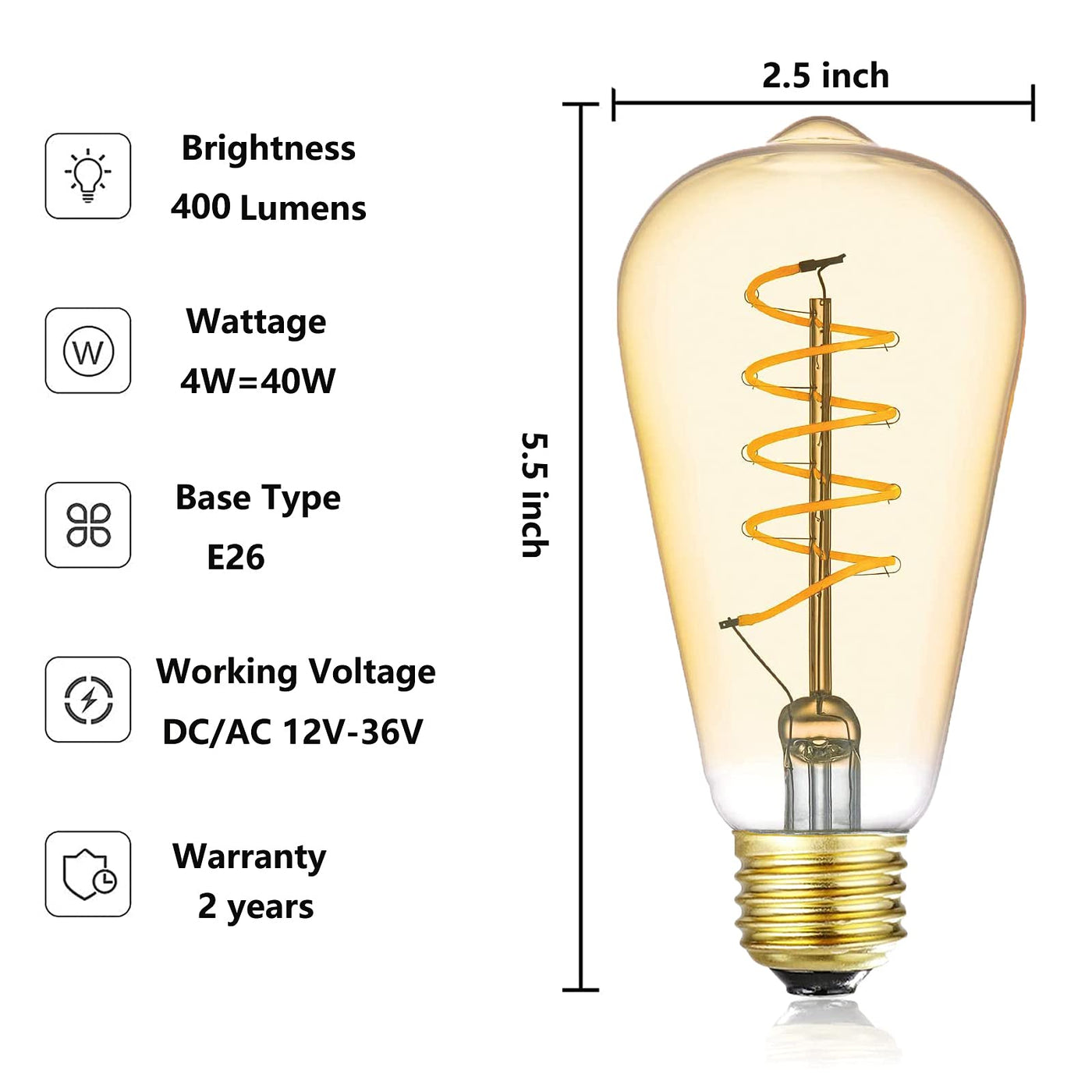 Product Features: 12V Flexible Spiral LED Filament Light Bulb 25,000 Lifespan LED Bulb Energy-saving Economical 2-year No-worry Warranty Product Specification: Bulb Shape: ST64 Lamp Base: E26 CRI: >80 Material: Amber Glass Working Voltage: DC/AC 12-36V Wattage: 4W Not Dimmable Style: Vintage Package Weight: 0.093lb Product Size: 2.5'' x 5.5'' Package Size: 2.76'' x 2.76'' x 6.07'' Warm Notice: If you're not satisfied with the product you purchased, don't rush into return process first, Contact us via message! We would try our best to make it right for you. Any questions, also welcome to contact us! PACKAGE INCLUDES: 3pcs x 12V LED edison Bulb Warm White 2700K
