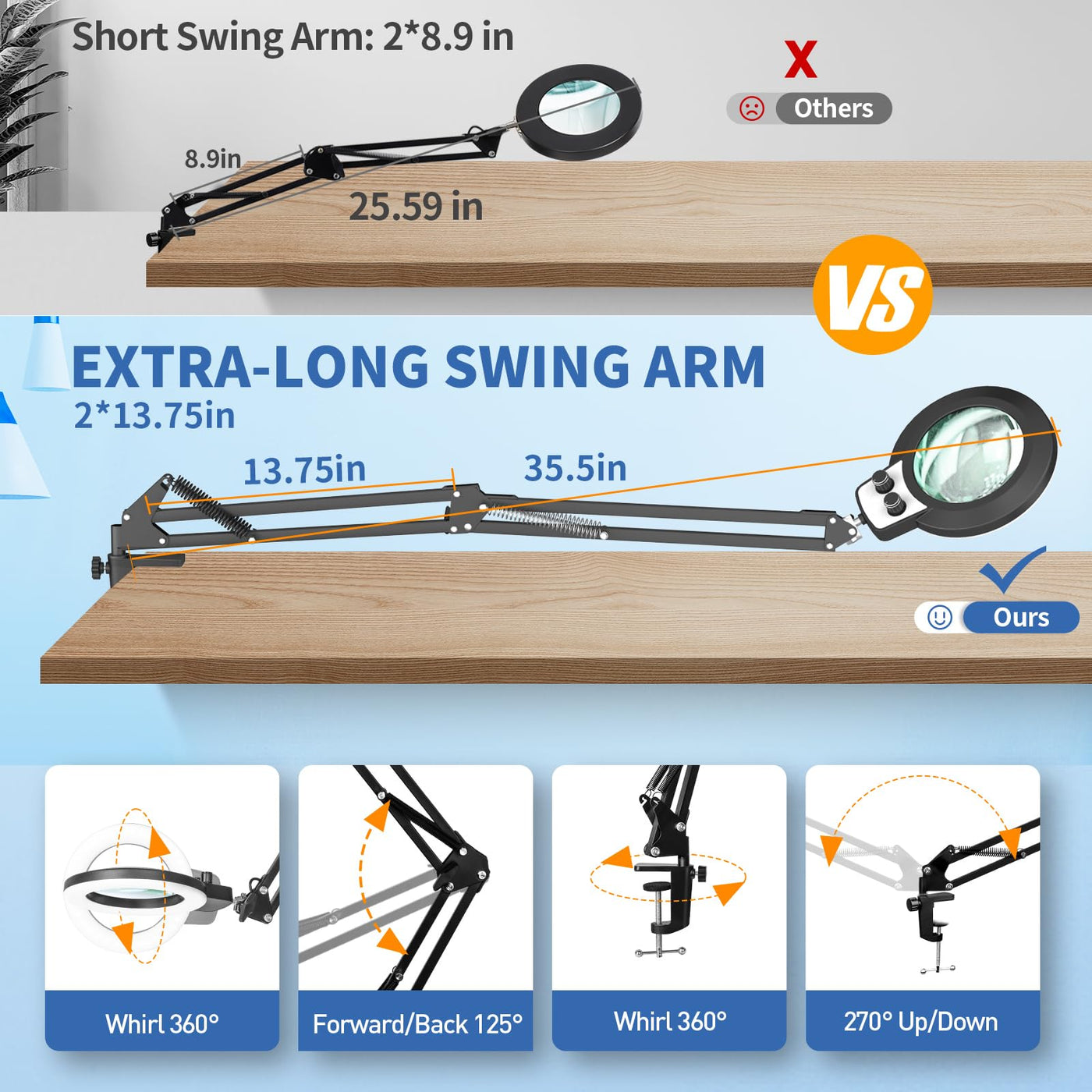 Q: Is the magnifying glass easy to adjust and position?A: Absolutely! The magnifying lamp features a powerful swing arm and a sturdy metal clip that ensures stability while allowing easy adjustment. The 360° horizontal head rotation knob provides flexibility in positioning the lens to suit your specific needs without tipping over.