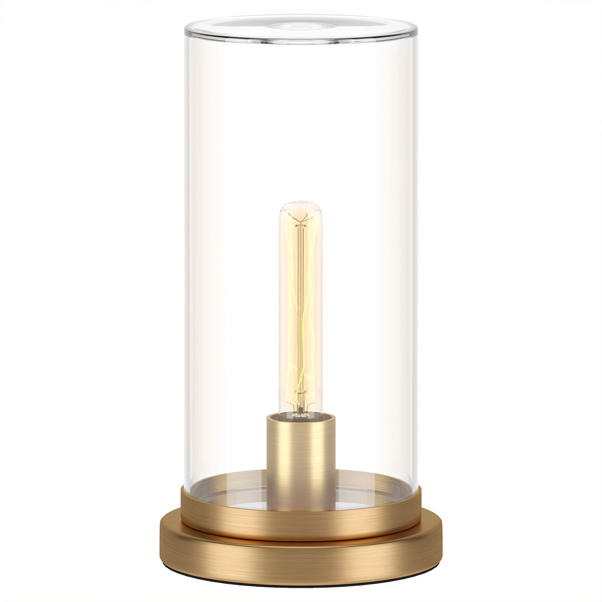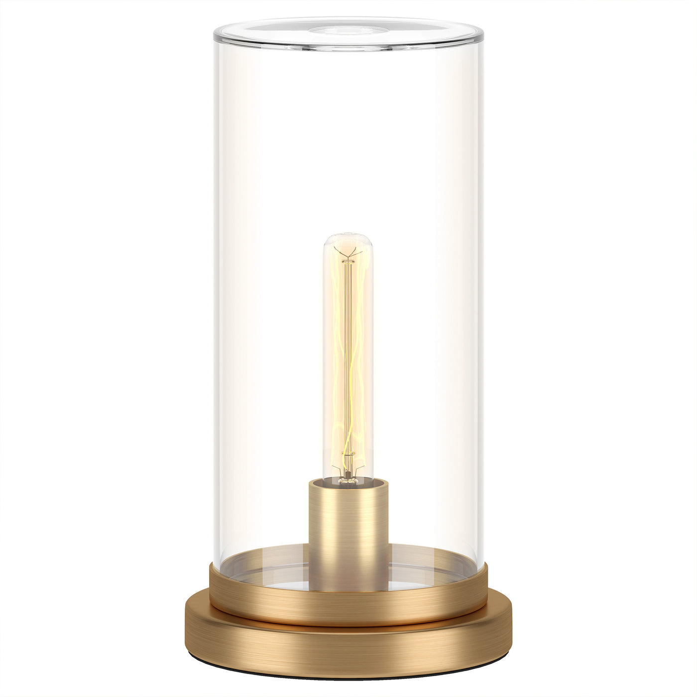This 13-inch brass metal table lamp with clear cylinder shade is the perfect combination of design and function. The lamp is made of sturdy metal and features a brass color. Includes a clear glass, cylinder shaped shade, making this a fashionable piece that will complement most any interior. This standard table lamp is designed to provide general lighting to the area. Use this lamp anywhere and elevate the look of the whole space. The perfect lamp to create just the right natural and soothing light in your space. 13.25-inch H x 7.13-inch W x 7.13-inch D