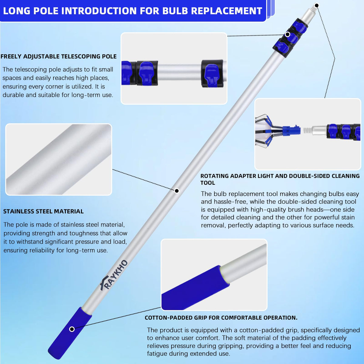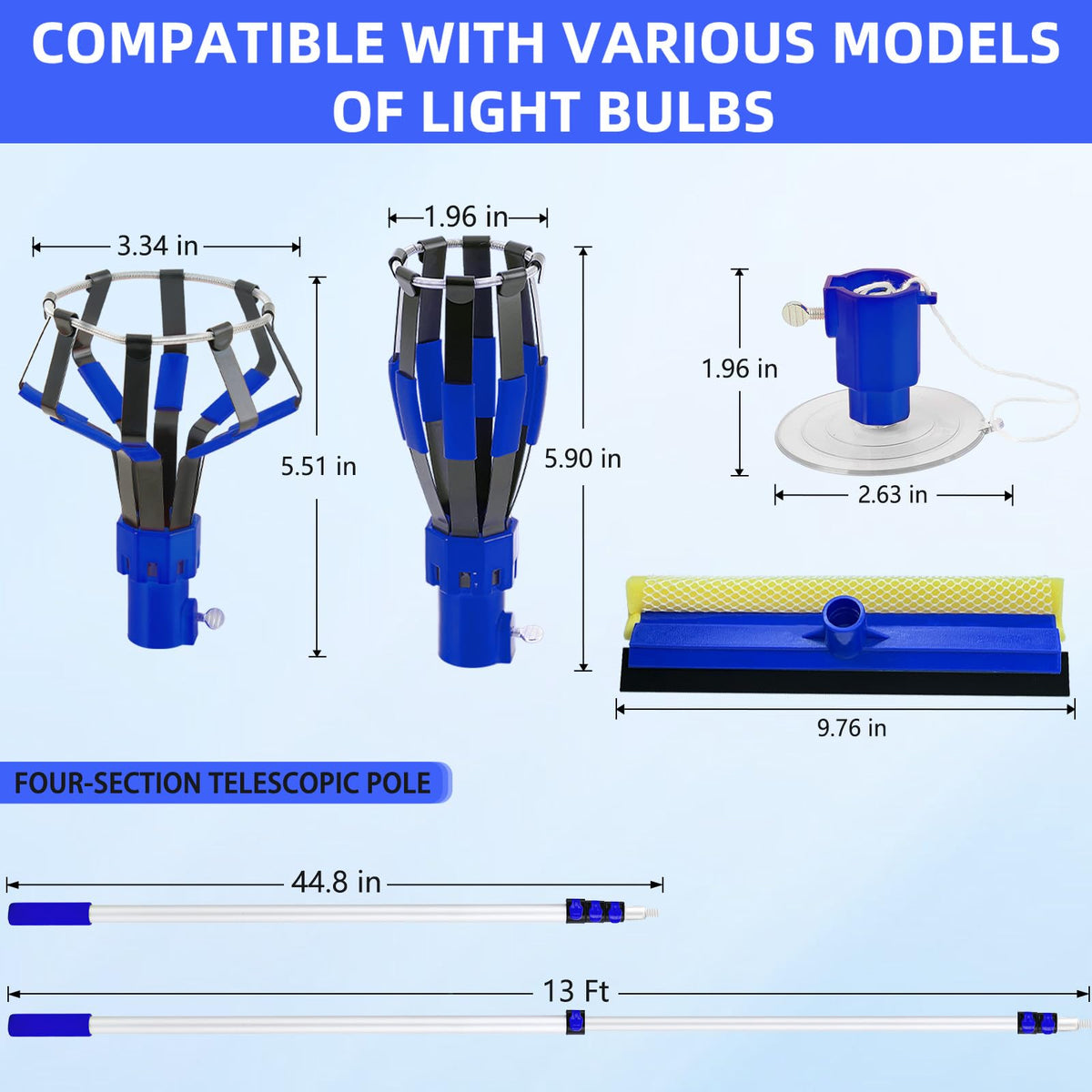 13Ft Extension Pole Light Bulb Changer with Baskets and Suction Cup - Ideal for High Ceilings and Recessed Lights - Household and Camping Bulb Removal Tool, Includes Dual-Sided Cleaning Brush