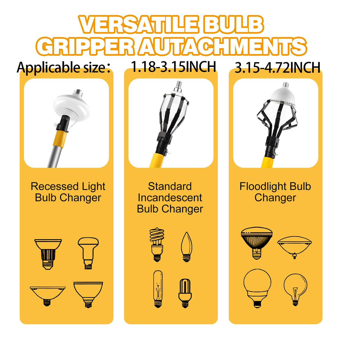Sturdy and Durable Construction:Crafted from high-quality stainless steel,the BTEC light bulb changer pole is not only resistant to bending but also lightweight, ensuring ease of use without compromising on strength.This makes it perfect for both indoor and outdoor use,providing longevity and reliability. Adjustable and Secure:Equipped with an adjustable silicone touch strip,the eight-finger cages offer a secure grip on bulbs of various sizes.This feature ensures that bulbs are held firmly in place, preventing any shaking or accidental drops during the changing process. Easy Installation:Each accessory comes with a fixed screw that allows for a secure attachment to the top of the pole.This design ensures that the changer remains stable and safe throughout the bulb replacement, giving you peace of mind as you work. User-Friendly Design:The light bulb changer pole is designed with user convenience in mind.Its lightweight nature and ergonomic handle make it easy to handle,reducing fatigue and making the task of changing bulbs quicker and more efficient. Versatile Use:Ideal for use in high-ceiling spaces such as living rooms,foyers,warehouses,and more,the BTEC light bulb changer is versatile and adaptable to various environments.Whether you're at home or in a professional setting,this tool is designed to meet your needs.